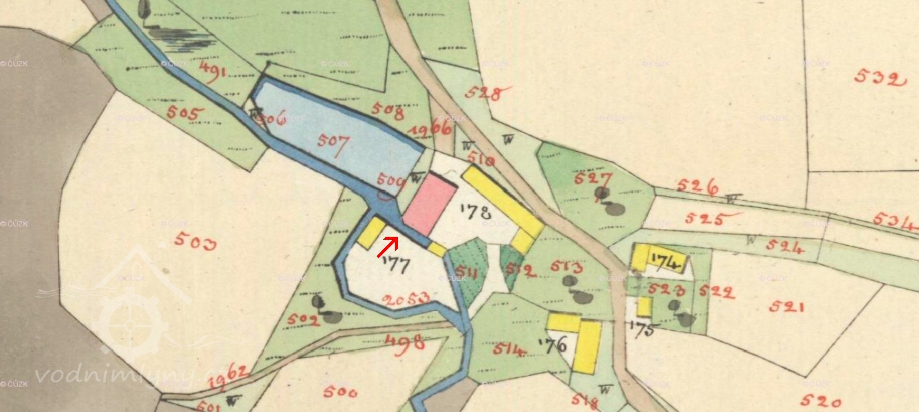 Popis1930: 1 kolo na svrchní vodu, hltnost 0,26 m3/s, spád 3,4 m, výkon 7,5 HP