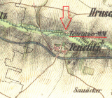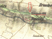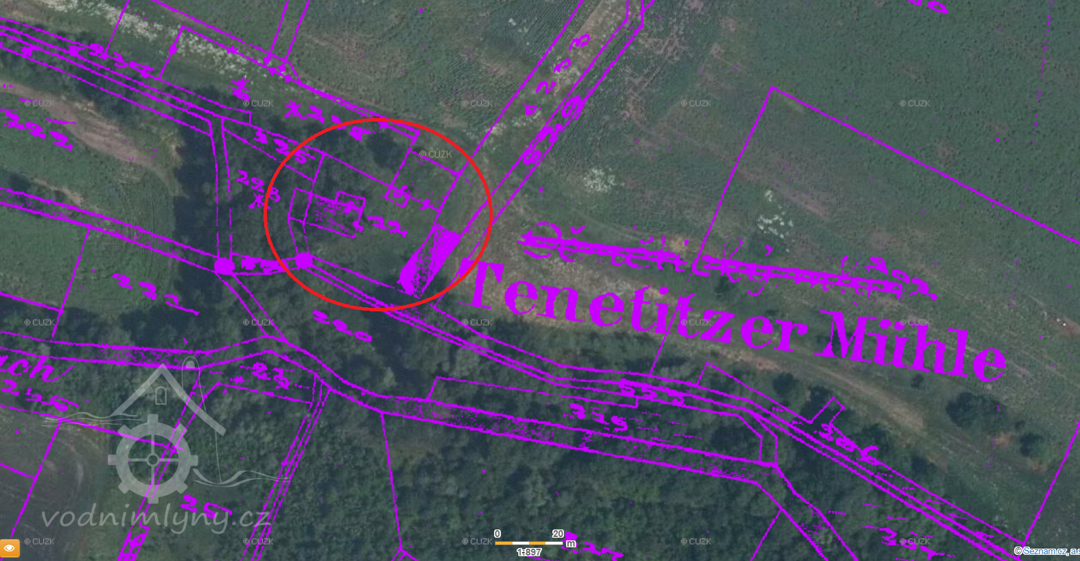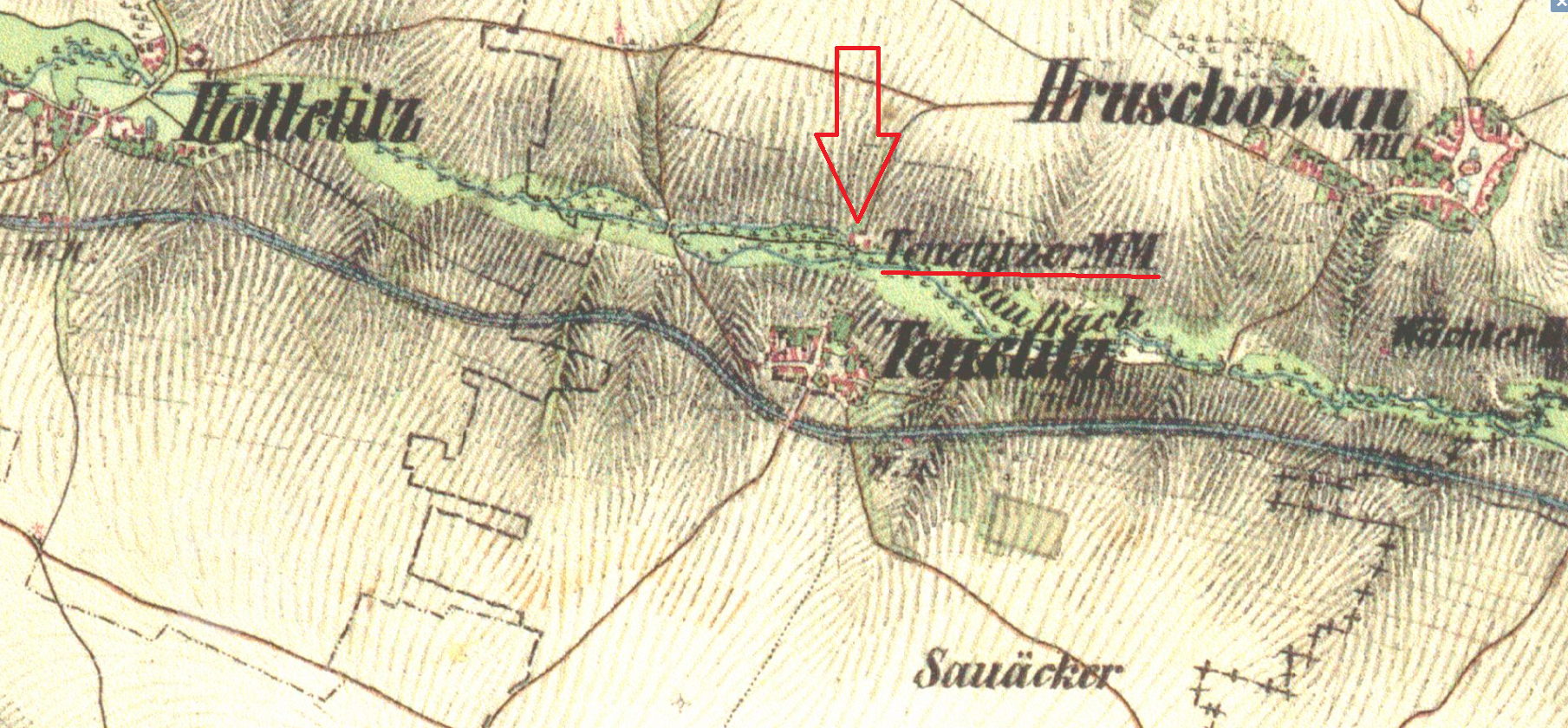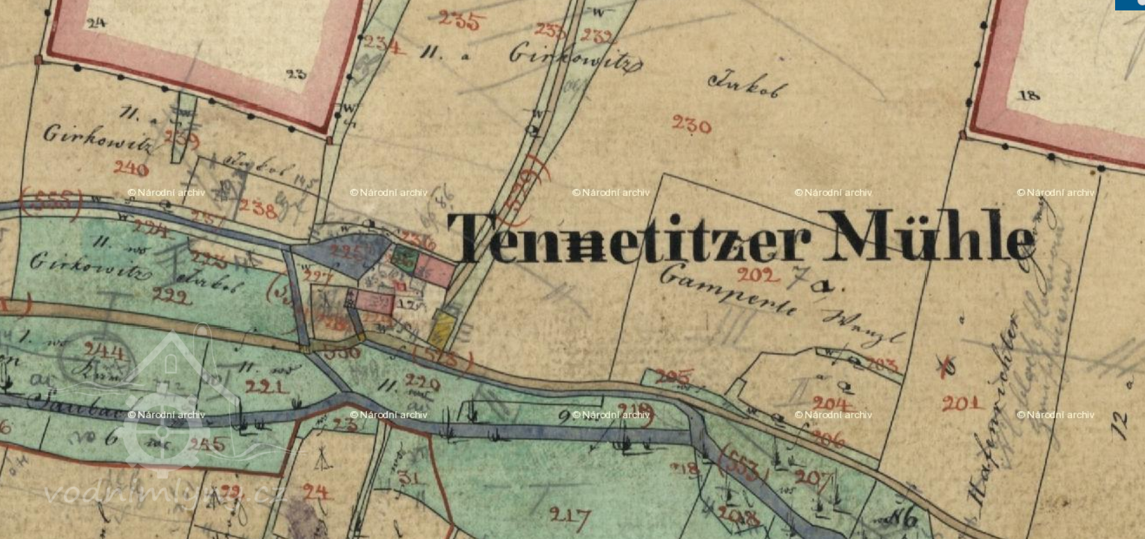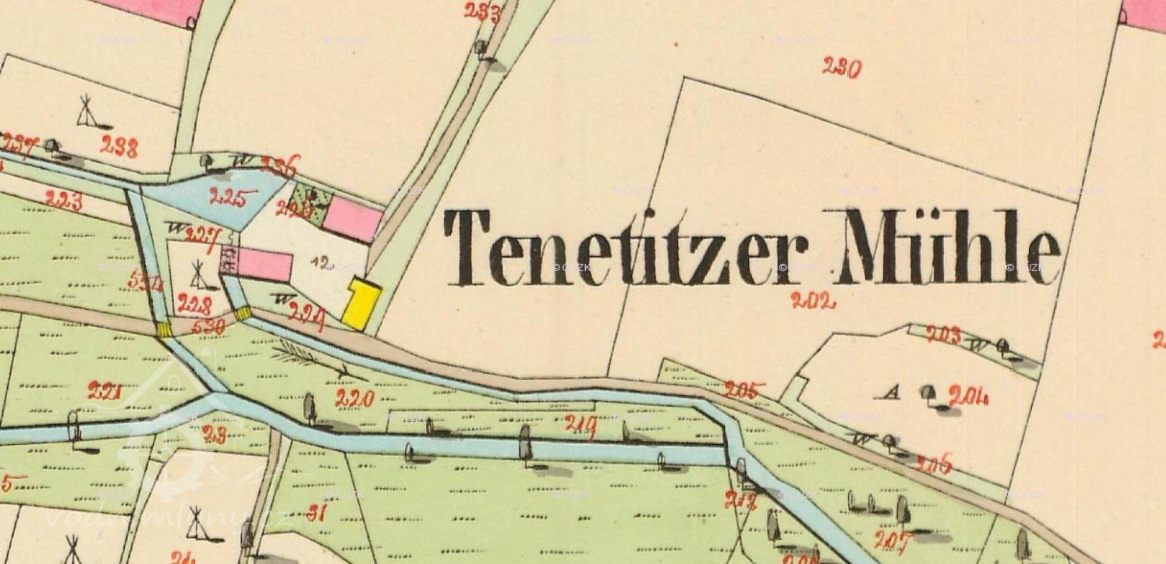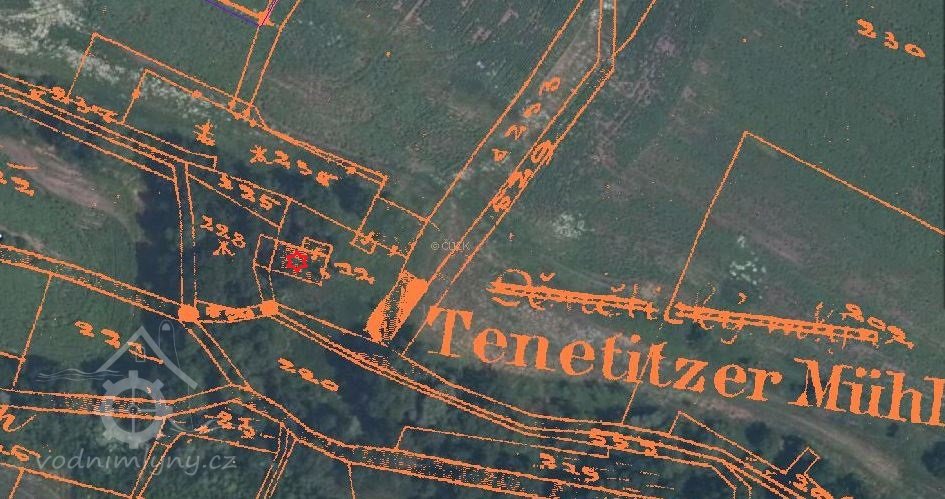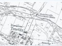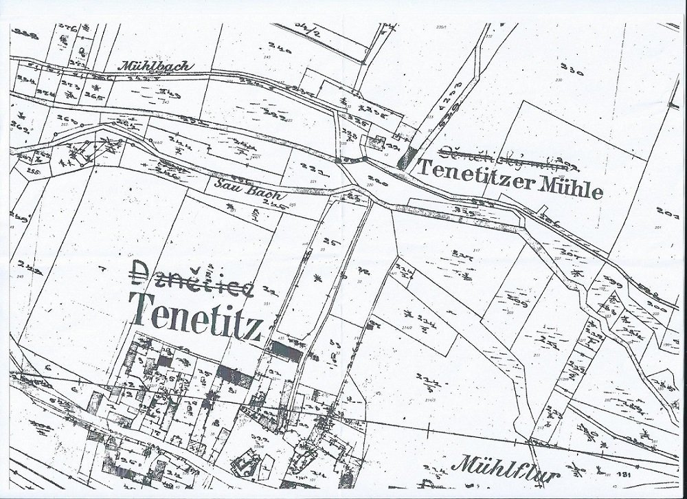 Větší mlýn na samotě severně od Denětic, zanikl mezi lety 1953-1963.