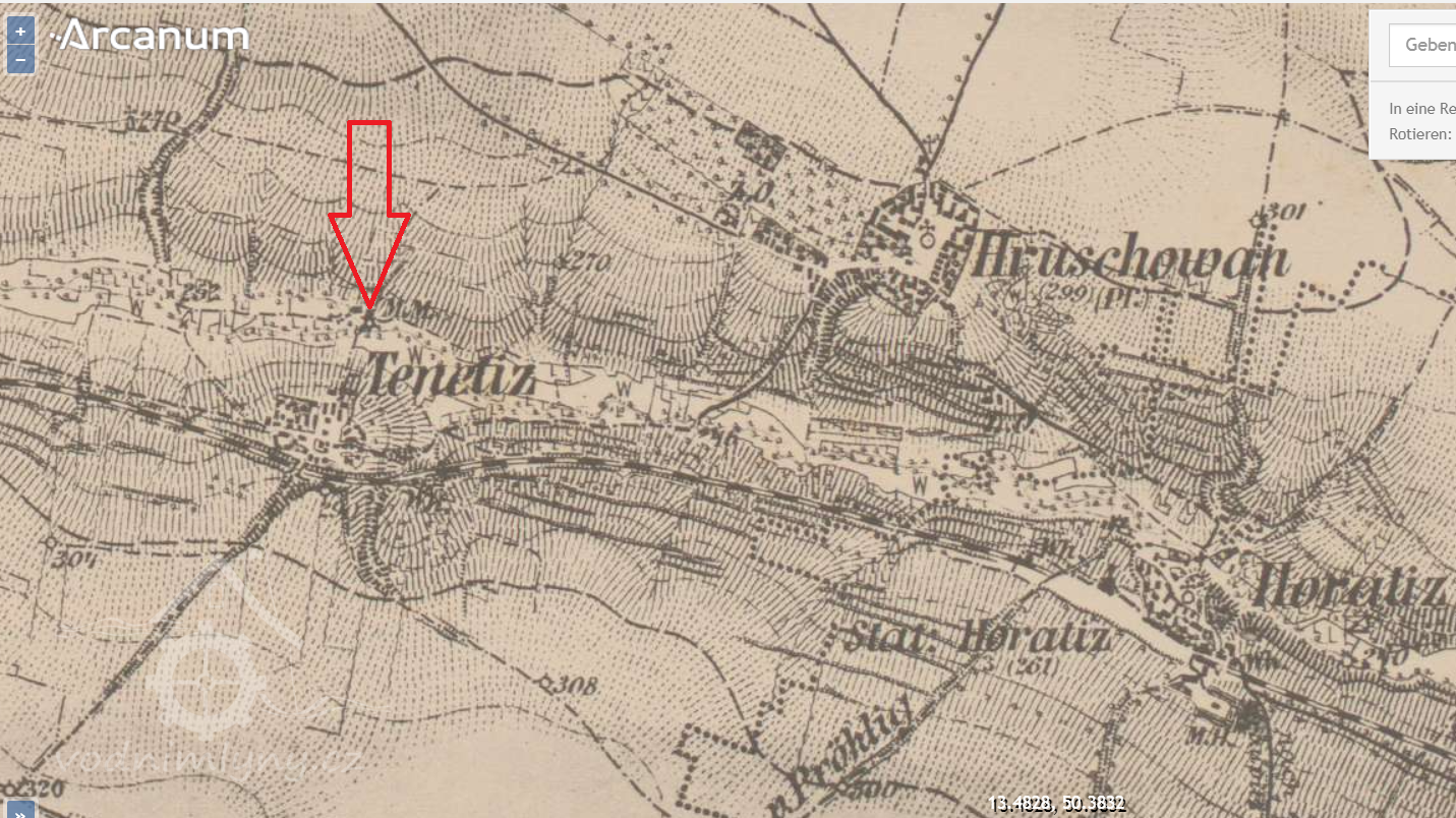 550 m severně od železniční zastávky Denětice