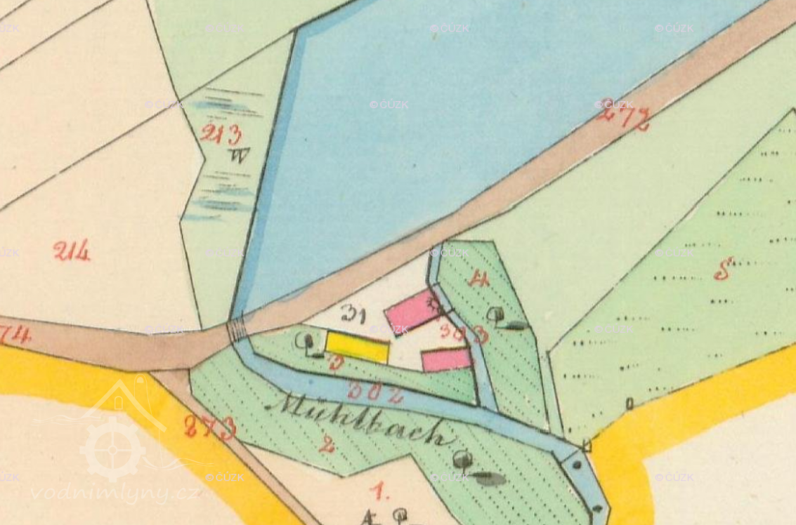Mlýn pod Zabrušanským rybníkem na jz okraji starých Zabrušan. V letech 1907-1912 celé Zabrušany včetně hřbitova a kostela (ten znovu vystavěn jako kopie původního) kvůli povrchovému dolu na hnědé uhlí přestěhovány o 500 m na severovýchod, mlýn však z technických důvodů nebylo možno přestěhovat a založit na novém místě, tak zanikl.