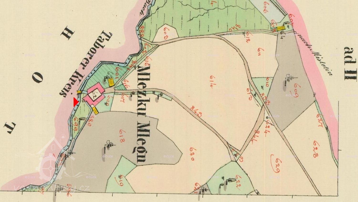 Na počátku horního vodního náhonu byl stanoven na č. parc. 597 obce Dudín vodní cejch. Sestává se z kamenného sloupce, na jehož povrchu jsou vytesána písmena J. T. a rok 1891. Na straně tohoto sloupce k vodě obrácené jest vodorovná rýha 40 cm pod povrchem hluboko, jejíž střed značí výšku splavu. Fixní bod jest vytesán na skále ve vzdálenosti 27,60 m od cejchu u lesa ve tvaru J. T. (trojúhelník na špičku) 1891. Druhý fixní bod u mlýna jest vytesán na kámen na rohu zdi pily při hladině vodní zazděném ve tvaru J. T. (trojúhelník na špičku) 1891.“