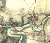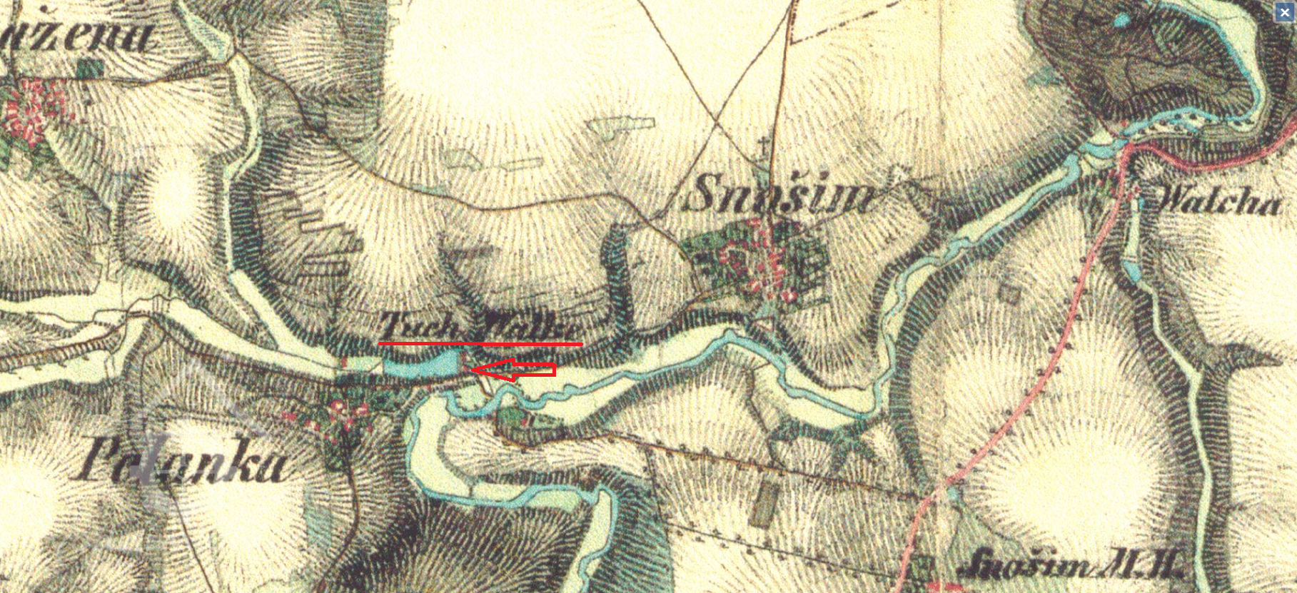 Nad mlýnem (původně valchou) býval velký rybník, dnes vypuštěný.