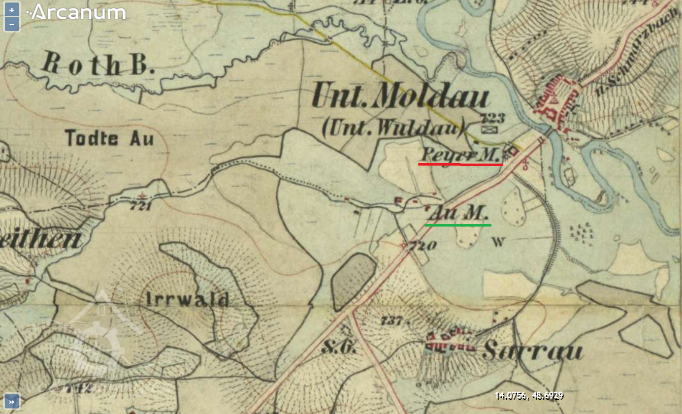 Větší mlýn, pila a elektrárna na samotě severně od Kyselova, po roce 1952 zatopen vodou Lipenské přehrady.