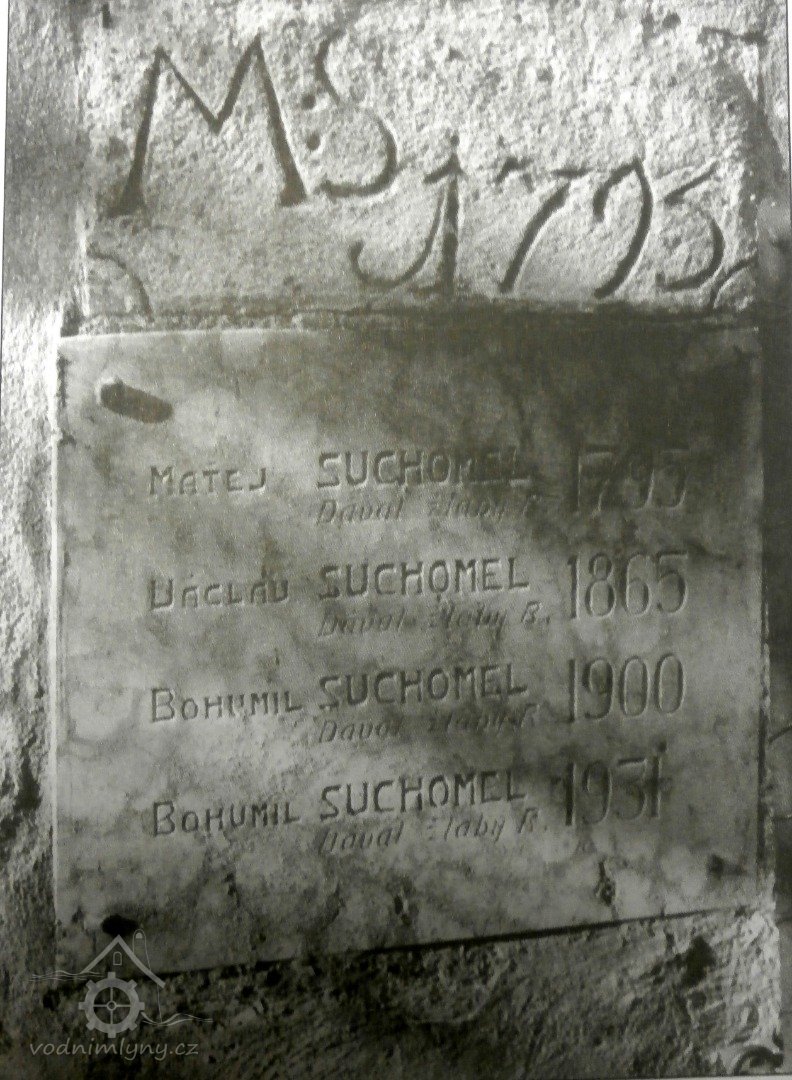 R. 1845 po smrti Josefa Suchomela, jež zemřel 16. ledna téhož roku ve věku 55 let, vloženo bylo vlastnické právo na mlýn polovicí synu Václavu Suchomelovi, druhé polovice vložena byla na základě svatební smlouvy ze dne 10. května 1852 manželce Karolíně Parmové z Turovce. Téhož roku přijat byl Václav do táborského cechu mlynářského a zaplatil poplatek přístupný 30 zlatých „Banko Nottek“20).