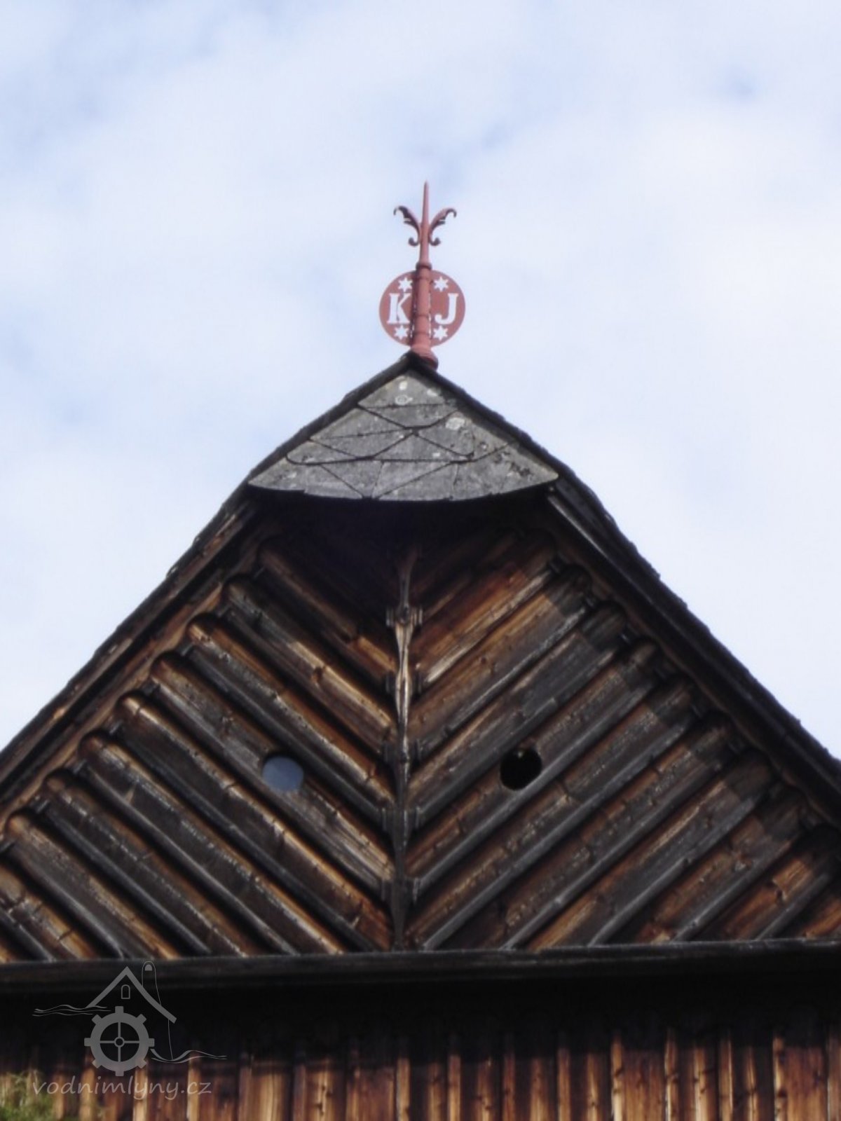 Na střešní korouhvičce jsou písmena KJ podle majitele a mlynáře.