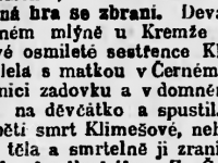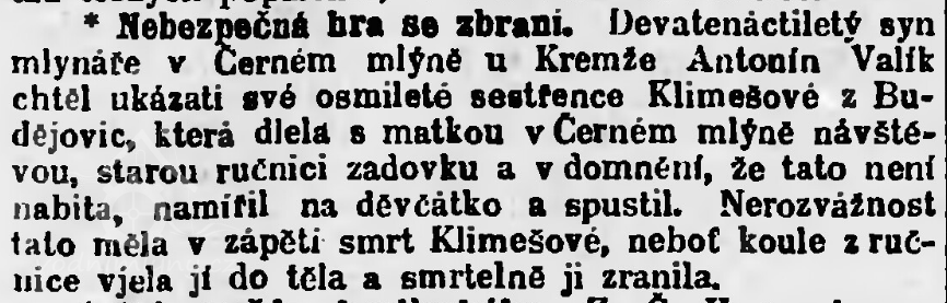 V r. 1903 zastřelil omylem syn mlynáře, 19letý Antonín Valík, svou osmiletou sestřenici. (RR)