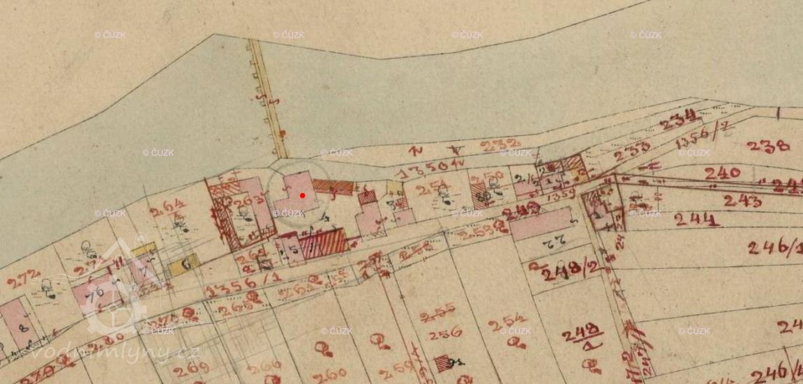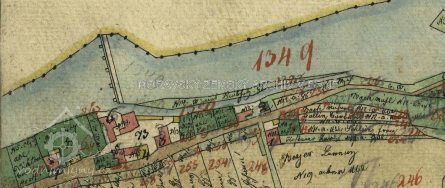 Popis1930: 1 kolo na spodní vodu, hltnost 1,07 m3/s, spád 1,3 m, výkon 5,5 HP
