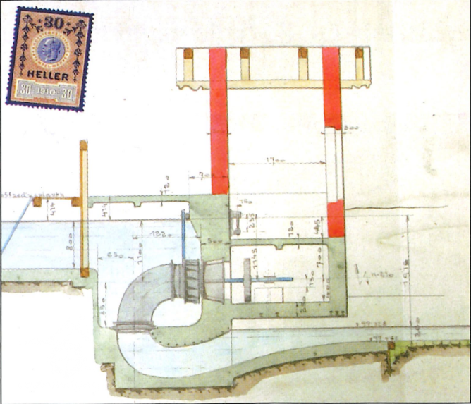 1930: 1 turbína Francis, hltnost 0,24 m3/s, spád 1,9 m, výkon 4 HP