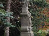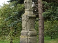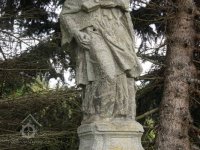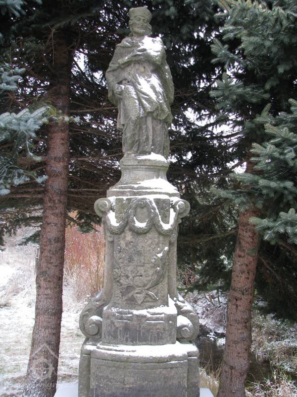 Socha světce Jana Nepomuckého v podživotní velikosti na tvarovaném třístupňovém hranolovém podstavci. Střední část podstavce po stranách doplněna volutami v horní části s girlandou. Svatý Jan Nepomucký v obvyklém ikonografickém pojetí s biretem na hlavě a krucixifem v náručí, v pravé ruce drží palmový list. Stopy případné polychromie nejsou zřejmé. Sokl v přední i zadní popsán textem, špatně čitelné. Socha provedena v klasicistním slohu.