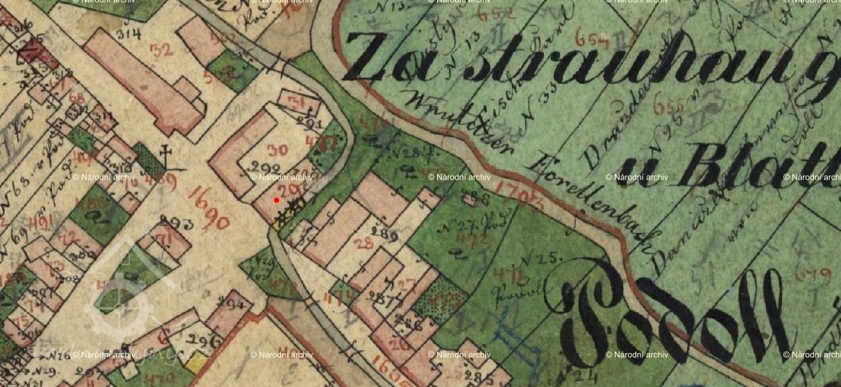 Je uváděn na plánu města ve stabilním katastru z r. 1842. U mlýna jsou uváděna 2 mlýnská kola, jedno pro mlýn, druhé pro městskou vodárnu. Ve mlýně-vodárně se provrtávaly smrkové kmeny, které se používaly jako vodovodní roury do města. Mlynář-nájemce musel mít znalosti nejen z oboru mlynářství, ale i znalost z vodárenství, Wasserkunstu.