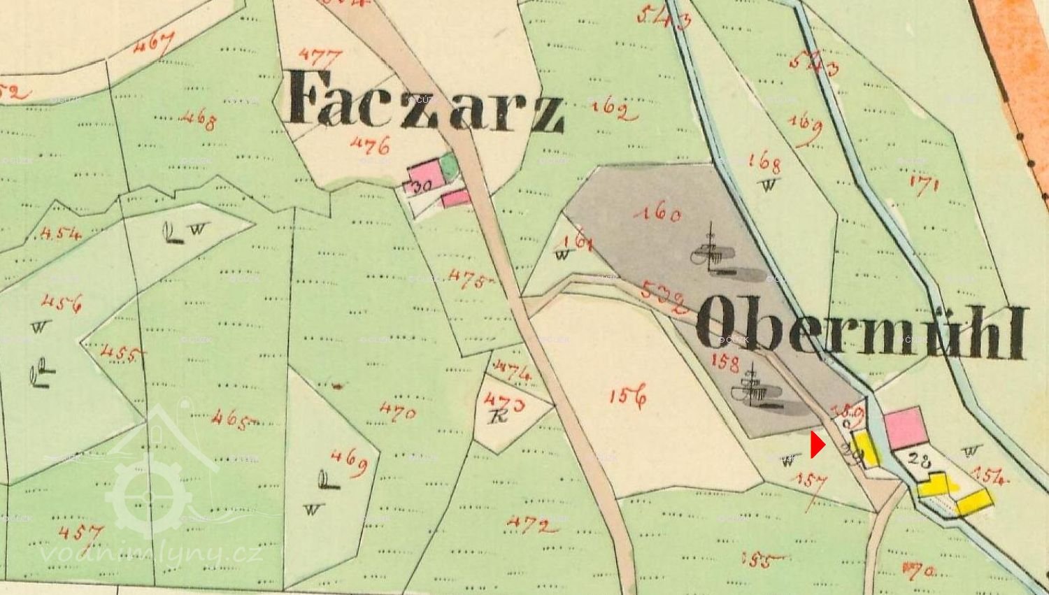 Vodní kniha I - Z výměru z 23.12.1924 schválem splav postavený v r.1923 a vodoprávně mlýn. Mlýn měl 3 vodní kola na svrchní vodu – kolo mlýnské průměr 3,5 m šířka; kola na šindelku 3,55 m a šířku 0,69 m; kolo ma pilu 3,66 m a šířku 0,65 m.