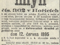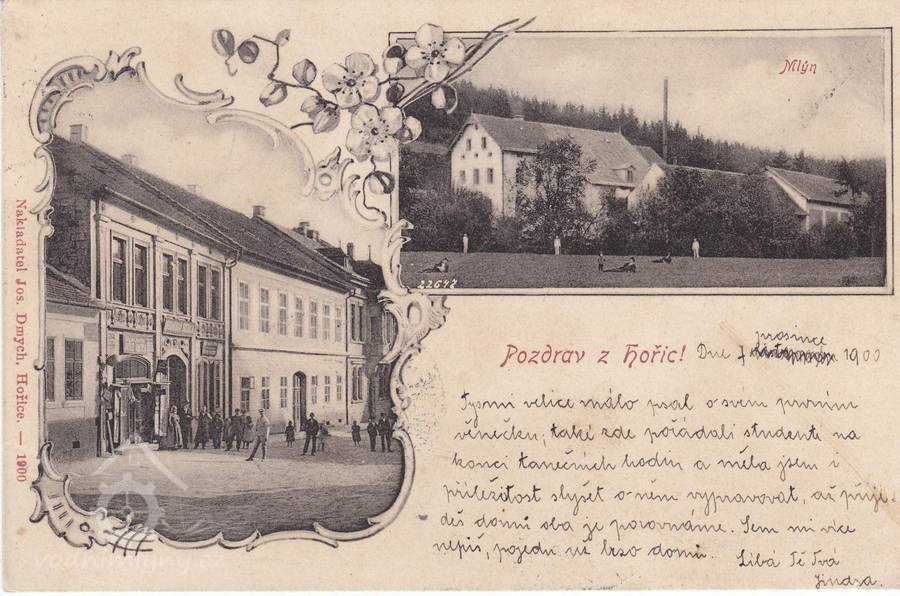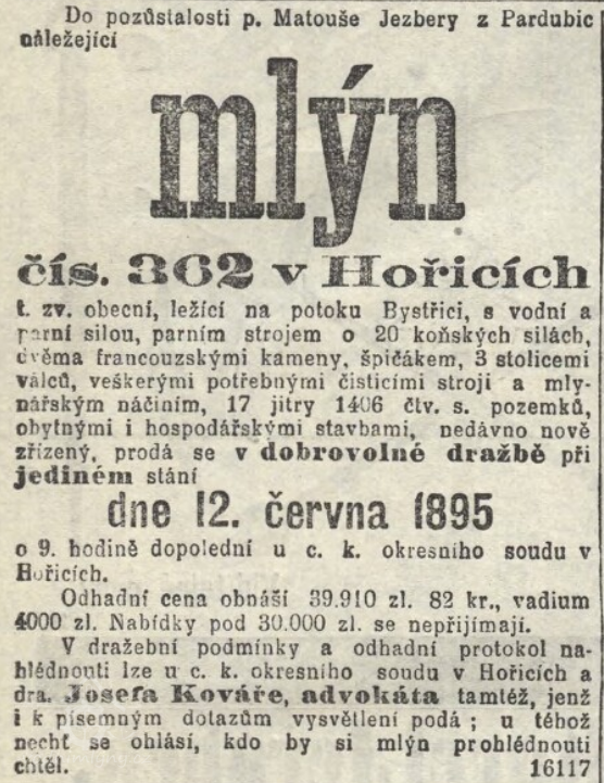 1895 dražba mlýna v odhadní ceně 39.910 zl. Pod 30.000 zl. nebude prodán. Majitel Matouš Jezbera z Pardubic.