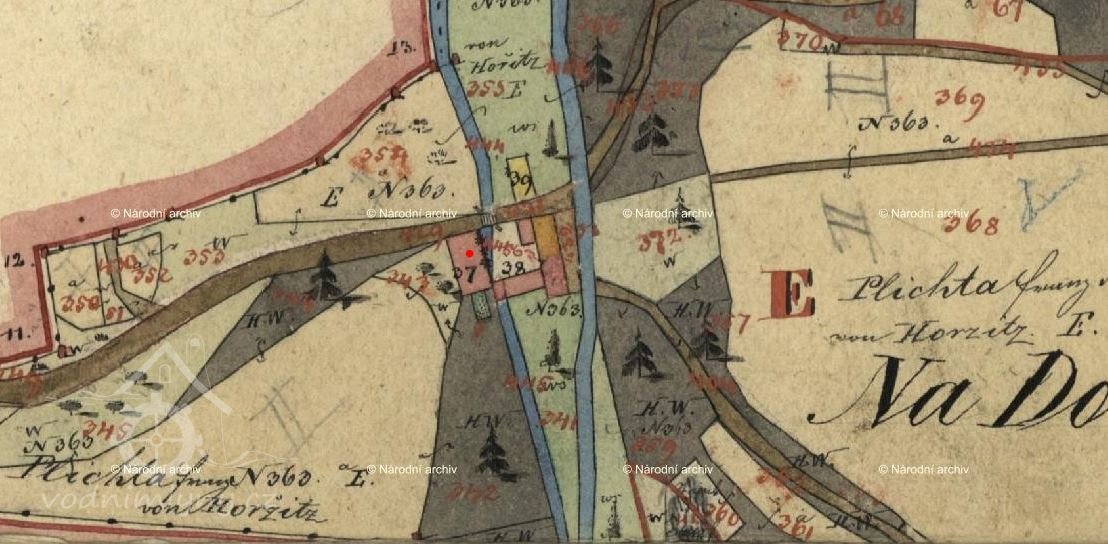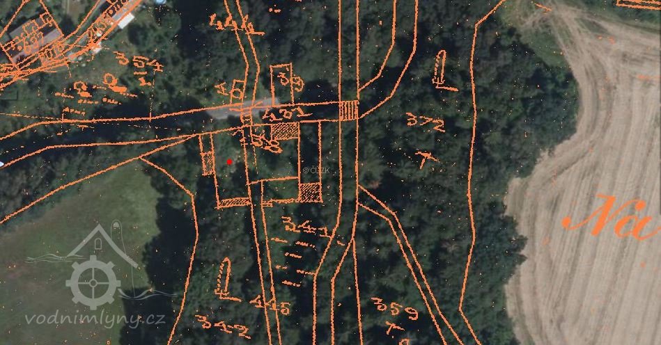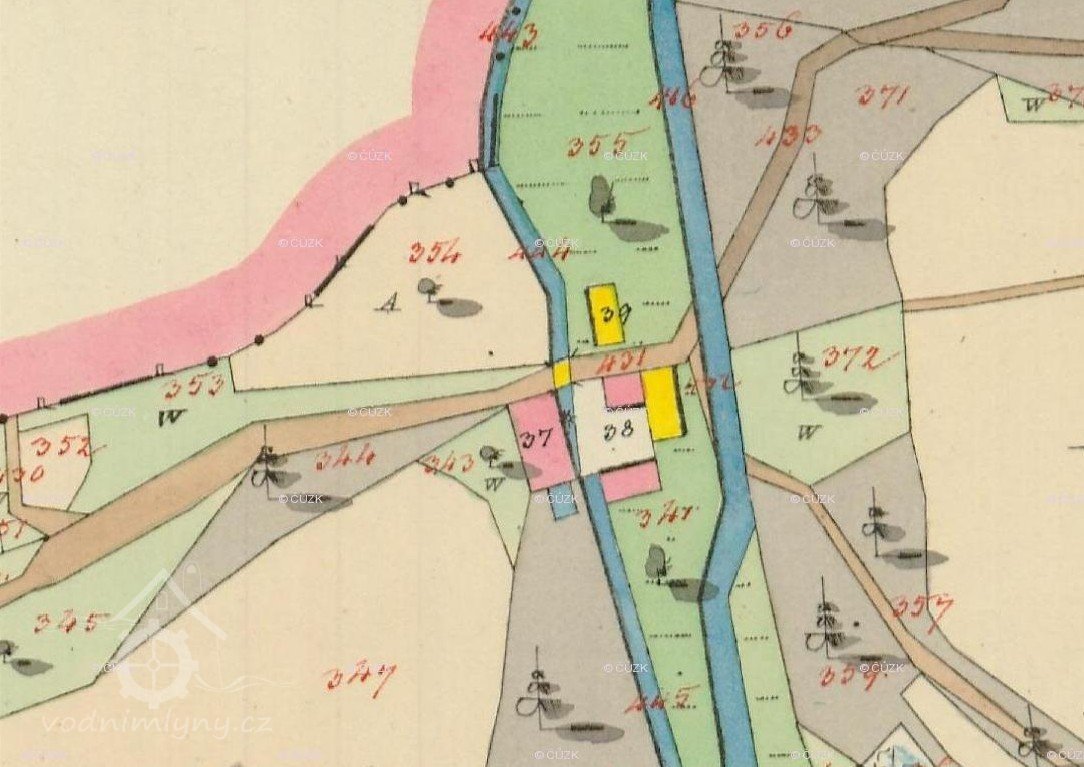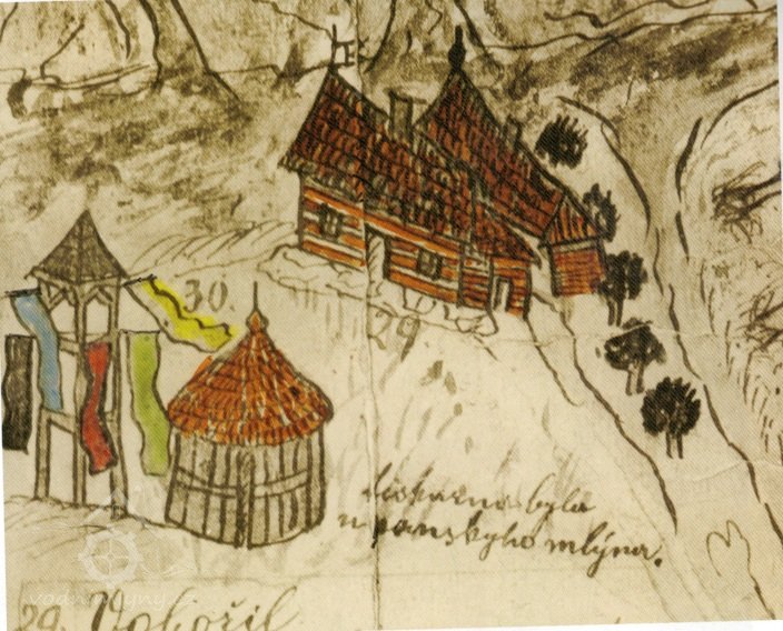 PopisDále zde bylo 1 kolo na svrchní vodu, průtok 0,202 m3/s, spád 3,8 m, výkon 6 k.
