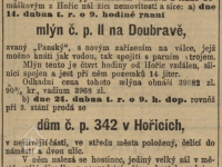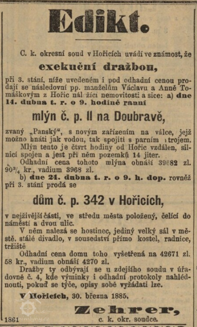 1885 dražba na mlýn, majitelé Václav a Anna Tomáškovi, odhadní cena 39.682 zl.