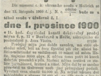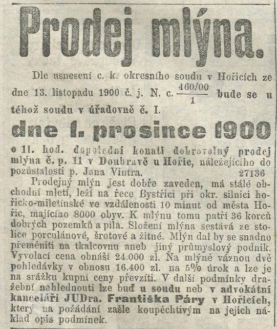 1. prosince 1900 dražba mlýna z pozůstalosti Jana Vintra.