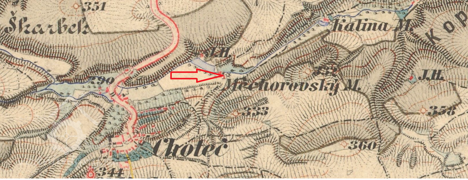 První písemná zmínka o obci Choteč pochází z roku 1336, avšak jméno jako takové bylo použito k pojmenování zdejšího potoka již v roce 1115.[i] Roku 1666 je poprvé zmiňován mlýn.[ii] Tehdy sem přišel ze mlýna pod Chejnicemi nový nájemce Měchurka. Povědomí o názvu „Měcháčův mlýn“ se dochovalo dodnes – tedy přes 340 let. Další zajímavou zmínkou je, že mlýn byl roku 1768 prodán jako dědičný majetek Janu Dočkalovi za 1000 zlatých rýnských a již v roce 1774 Václavu Michudovi s manželkou Annou za 2290 zlatých. Lze se domnívat, že za svého působení mlynář Dočkal budovu výrazně přestavěl, a tak zdvojnásobil její hodnotu. Za velmi podobnou částku – 2250 zlatých – koupil objekt roku 1776 Václav Veselý s manželkou Františkou. Mlýn měl na konci 18. století dvě složení a jednu stoupu.