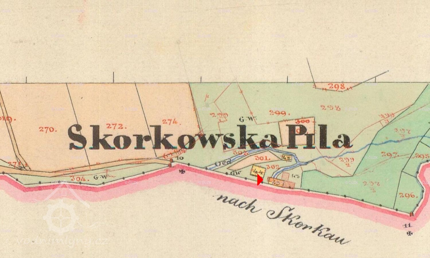 Mezi obcí Slavníč a mlýnem Na Pile pod Skorkovským rybníkem se tyčí dálnice D1. Mlýn vznikl někdy na začátku 19. století a kromě mletí obilí u něho byla vždy i pila. Oba provozy měly vlastní vodní kolo. Zvětšené vodní kolo bylo postaveno ve třicátých letech minulého století. V současnosti je mlýn opraven a slouží pravděpodobně k rekreaci.