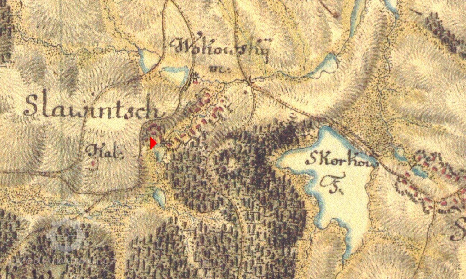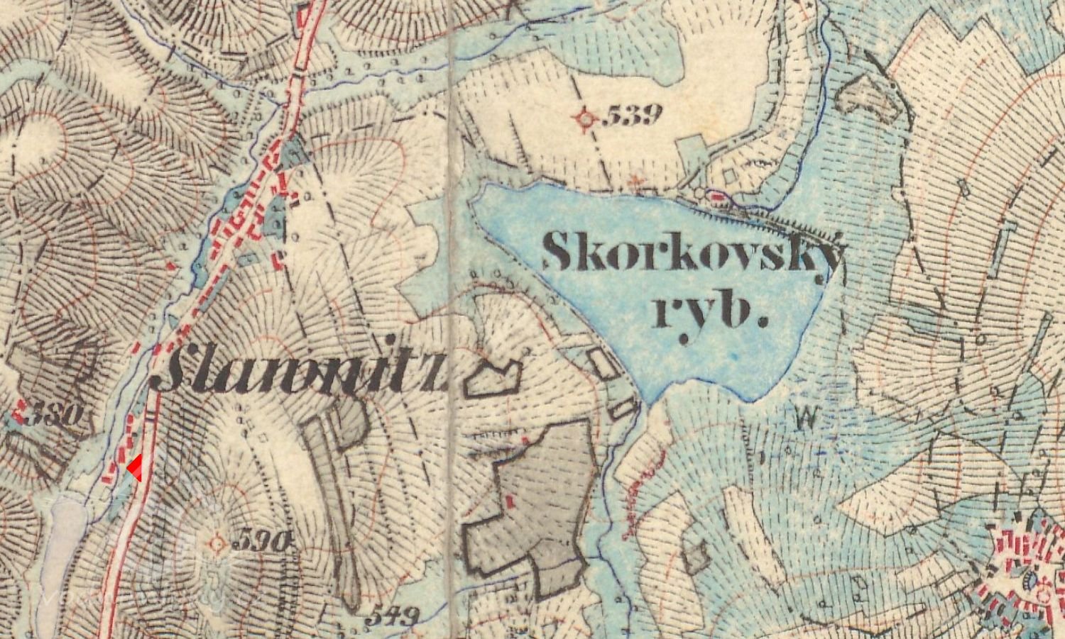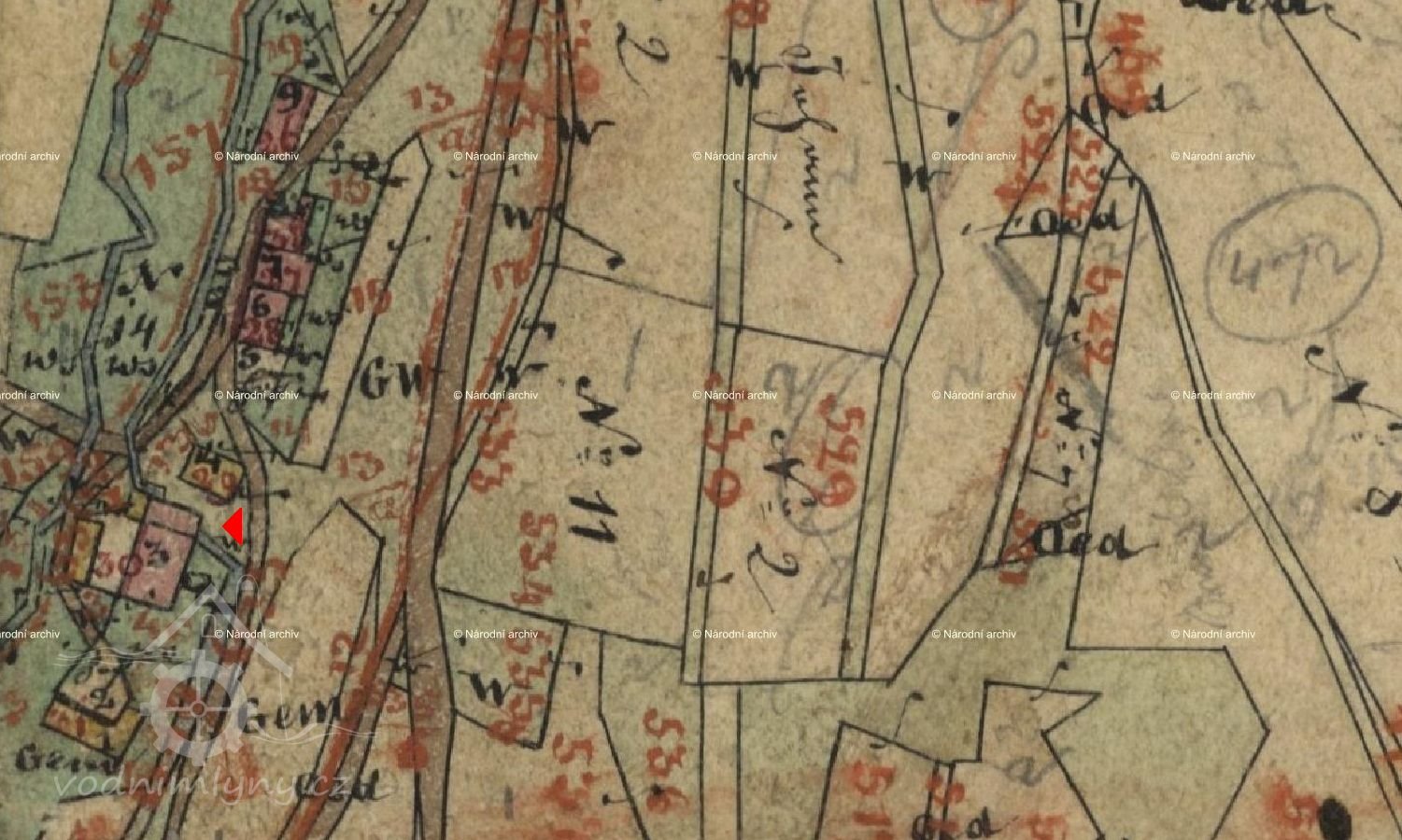 Mlýn čp.30 přijímá potřebnou vodu z rybníka tzv. Slavničského, patřícího velkostatku Herálec. Z rybníka přitéká voda ke mlýnu náhonem č.p.649. Na vodní kolo vede žlab 20 cm široký, který se ze strany vantrok uzavírá stavítkem 20 cm širokým a 32 cm vysokým. Před vantroky se nachází vpouštěcí stavítko 37 cm vysoké a 62 cm široké.