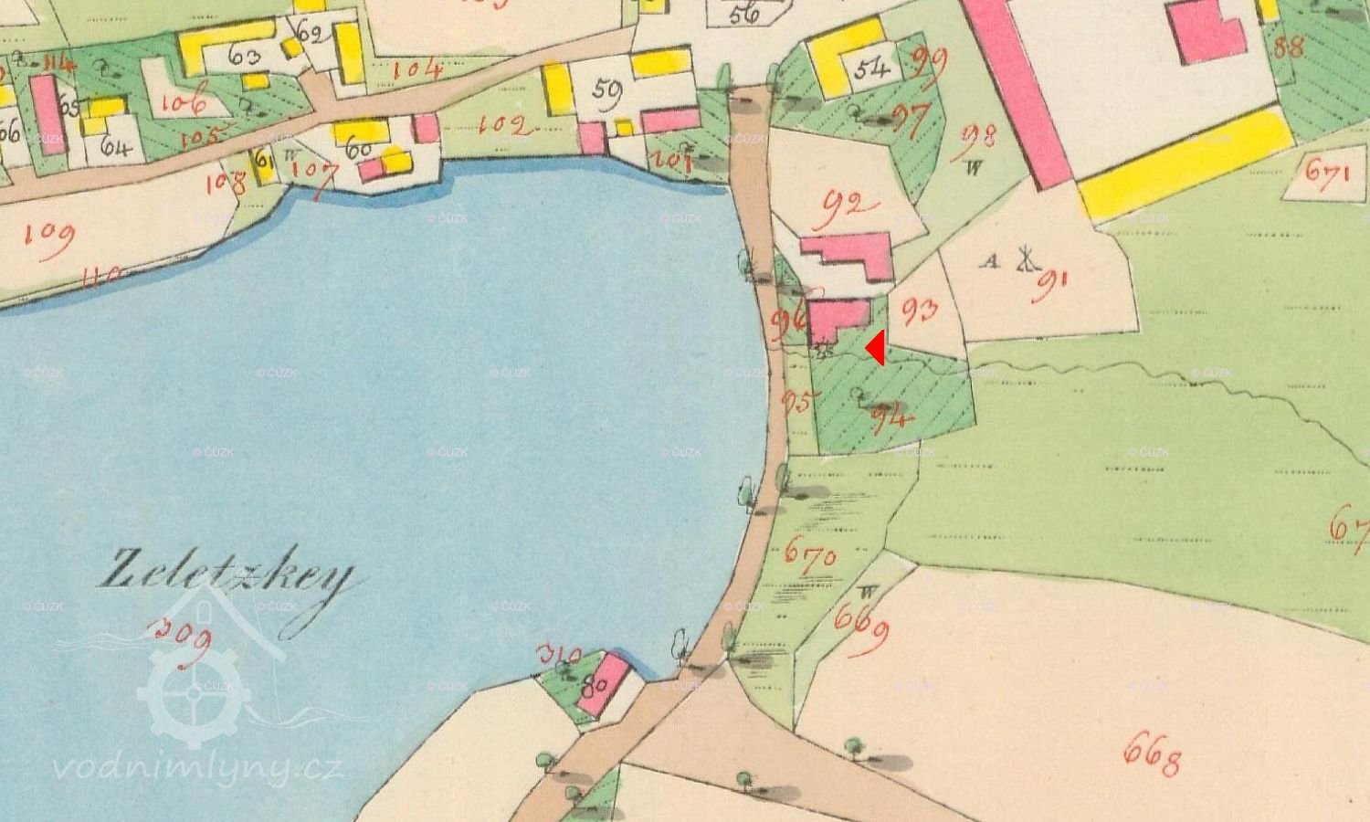 ...Ještě bych poznamenal k mlýnům: tzv. „Vodní kniha“ uložená v táborském okresním archívu, založená v roce 1850 uvádí vody a vodní mlýn v Želči čp.43. Je u něho uveden popis vodního kola, žlabu, průměr mlýnských kamenů (79 cm). U kola je napsáno: „Jest dřevěné, na horní vodu zařízené“. Roku 1879 je připsáno, že byl mlýnský stroj zrušen.