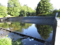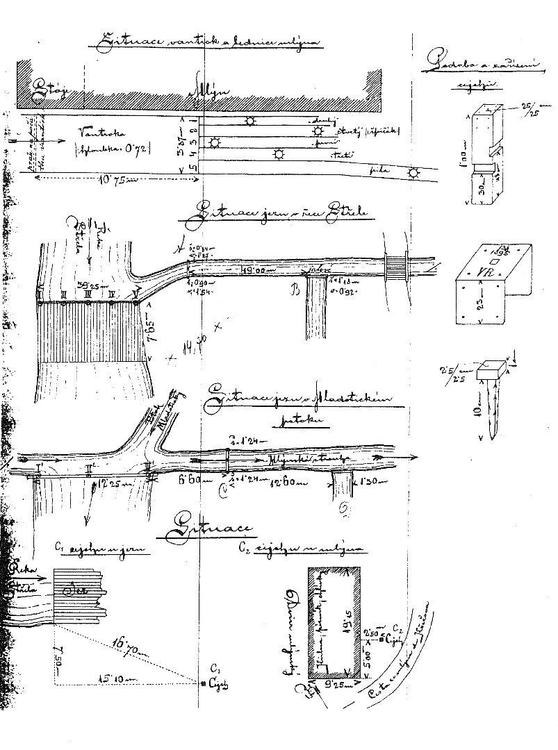 1895: Pevný jez na přepadovou vodu v řece Střele kolmo na směr toku, v hřebenu 39,25 m dlouhý a po směru toky od záplavy 7,65 m široký. Jez poničen při povodních 1922 (oprava 100 000 Kč) a 1924 (oprava 80 000 Kč).