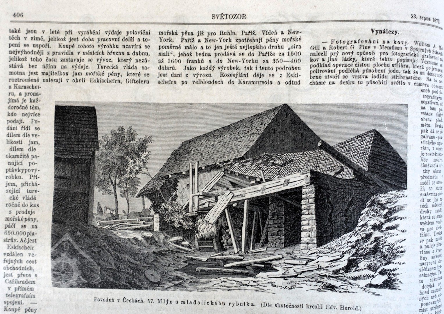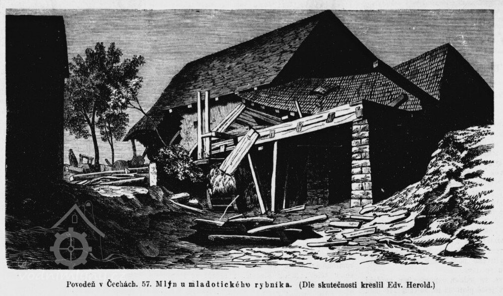 Velký Mladotický rybník (119 jiter, přes 100 ha) nad mlýnem protržen při povodni 1872 a již neobnoven