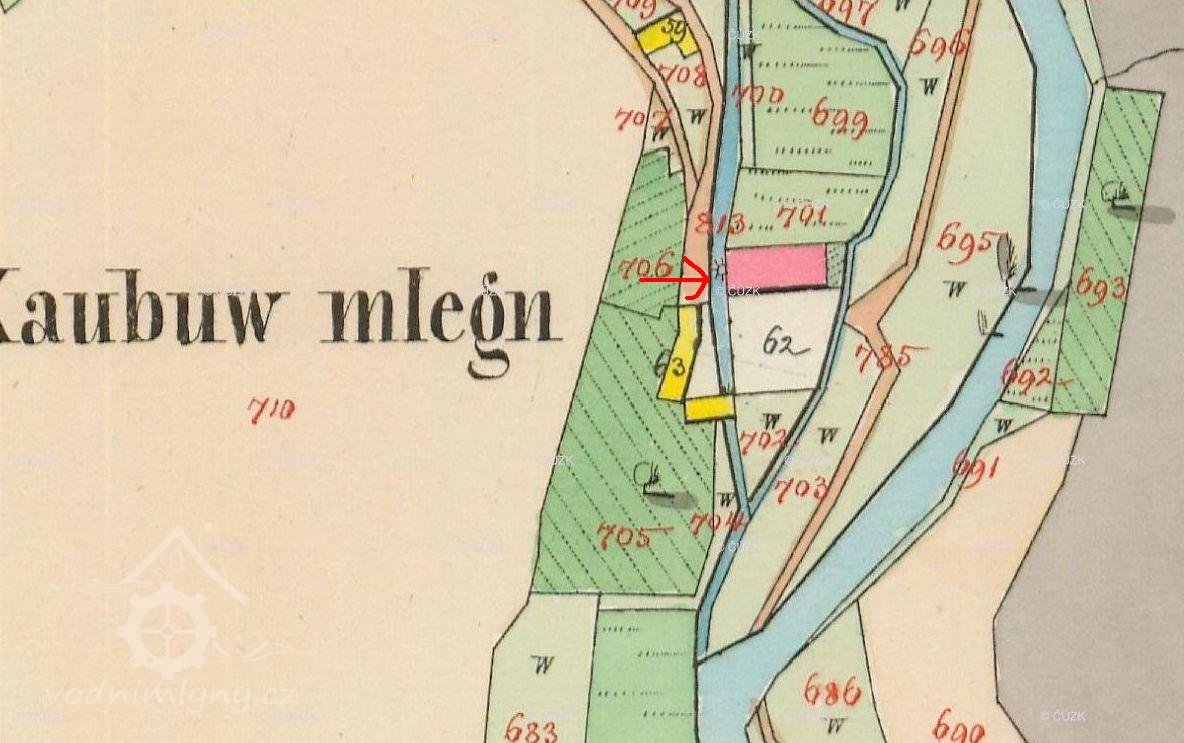 13. července 1895 provedeno cejchování vodního díla. Na mlýně a pile čp. 65 je mlynářem František Cach. Obě zařízení jsou poháněna vodou z potoka Javornice. Voda je prostřednictvím jezu vzedmuta a odvádí se mlýnskou strouhou do nádržky. Vlastník vodního díla jest povinen jez i mlýnskou strouhu v řádném stavu udržovati. Vody z nádržky užívá se jednak k pohonu pily a dvou mlýnských složení prostřednictvím dvou vodních kol na svrchní vodu zřízených. Na pilu přivádí se voda stavítkem na počátku potrubí v břehu nádržky umístěným. Jez v potoce Javornici je pevný, přepadový z lomového kamene na divoko mezi podélnými a příčnými prahy vydlážděný. Ve hřebenu je mezi prsy 21,8 m dlouhý, V prvé části sklonité 4,6 m a v druhé příkře sklonité 1,75 m široký.