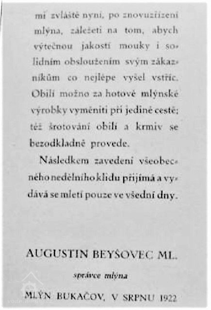 Jeho manželka prodala mlýn Jiřímu Vojtěchovi Bukačovi. Za Bukačů byl mlýn přestavěn do dnešní podoby. Mlýn byl následně pronajímán. V roce 1755 koupili mlýn Šmejkalovi, kteří jej vlastnili až do roku 1854. Od roku 1855 patřil mlýn Jiřímu Pleskotovi (jeho potomkem je architekt Josef Pleskot), po něm Janu Kavanovi a rodině Miškovských, která na konci 19. století mlýn přivedla ke krachu. Posledním známým mlynářem byl Augustin Bejšovec. Následně byl mlýn upraven a využíván jako lihovar a drožďárna.