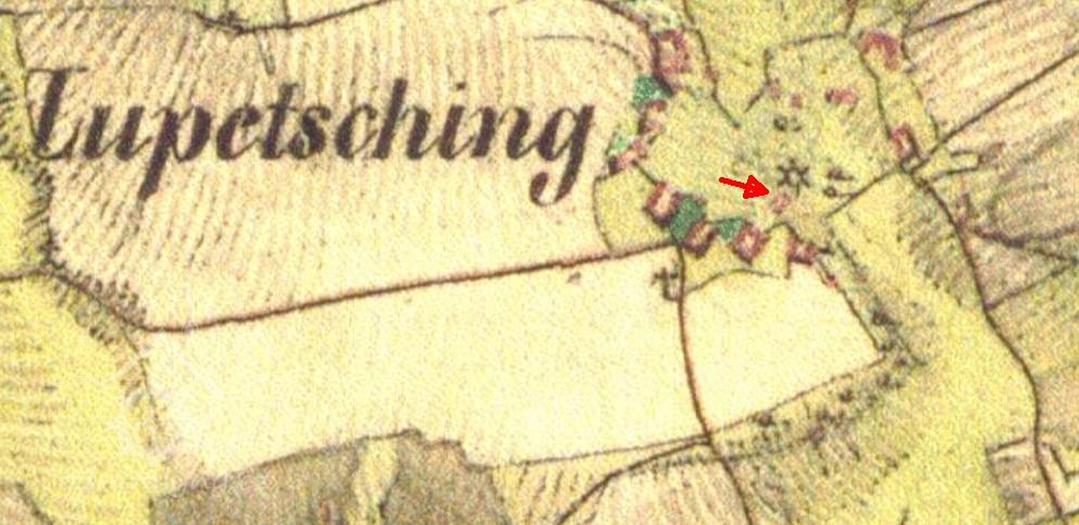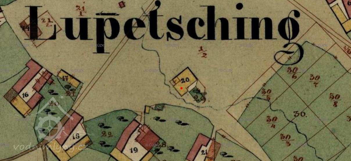 Mlýn je zakreslen na císařských povinných otiscích. Slupečná je na historických mapách uvedena jako Luppetching/Lupetsching.