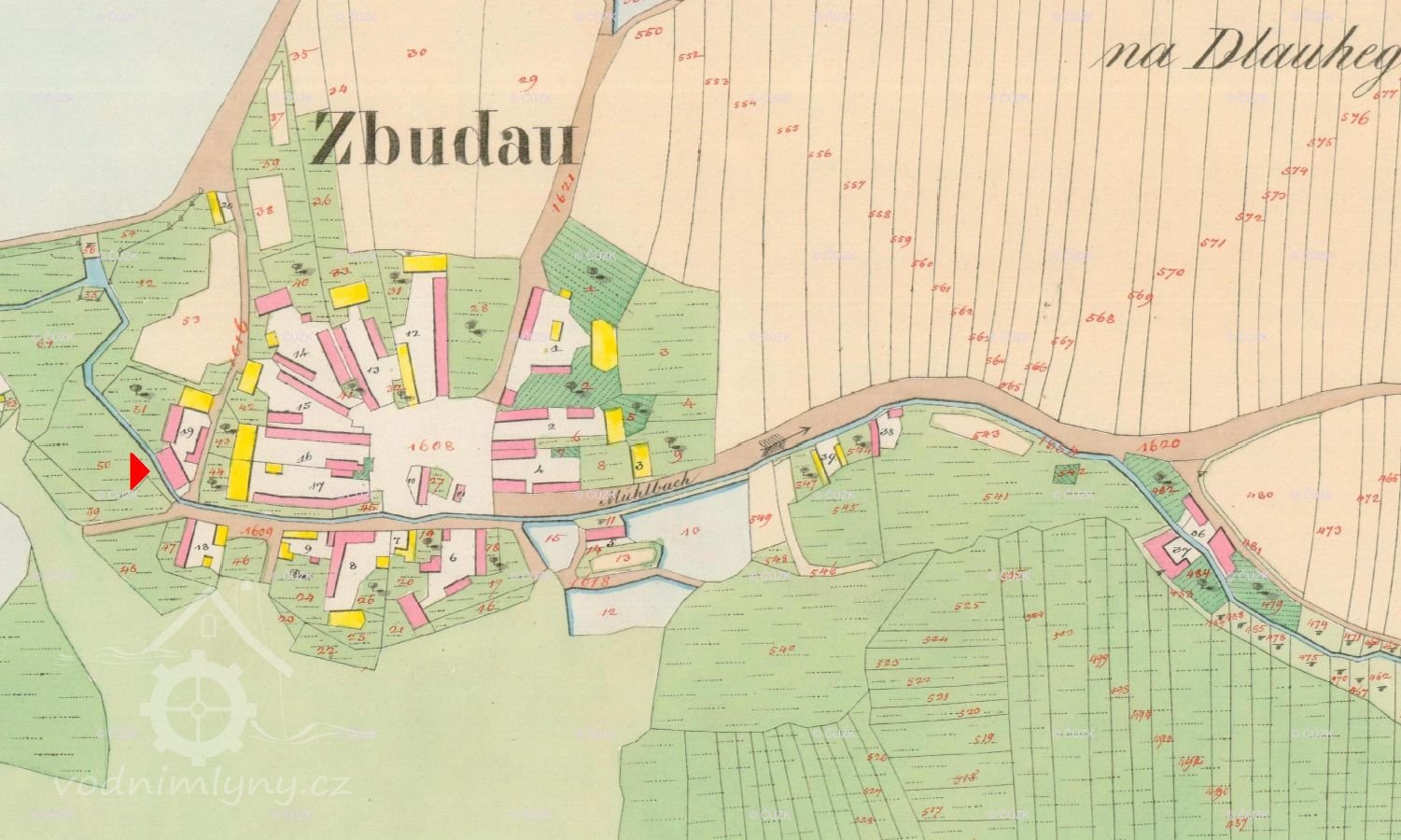 Areál mlýna původně ze 17. století, přestavěný na patrový válcový mlýn s Francisovou turbínou v první polovině 20. století, se nachází na západní straně vsi pod hrází Zbudovského rybníka.