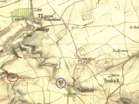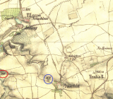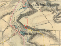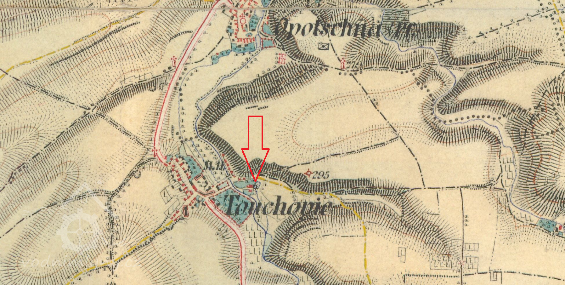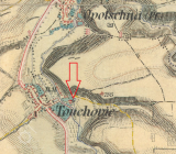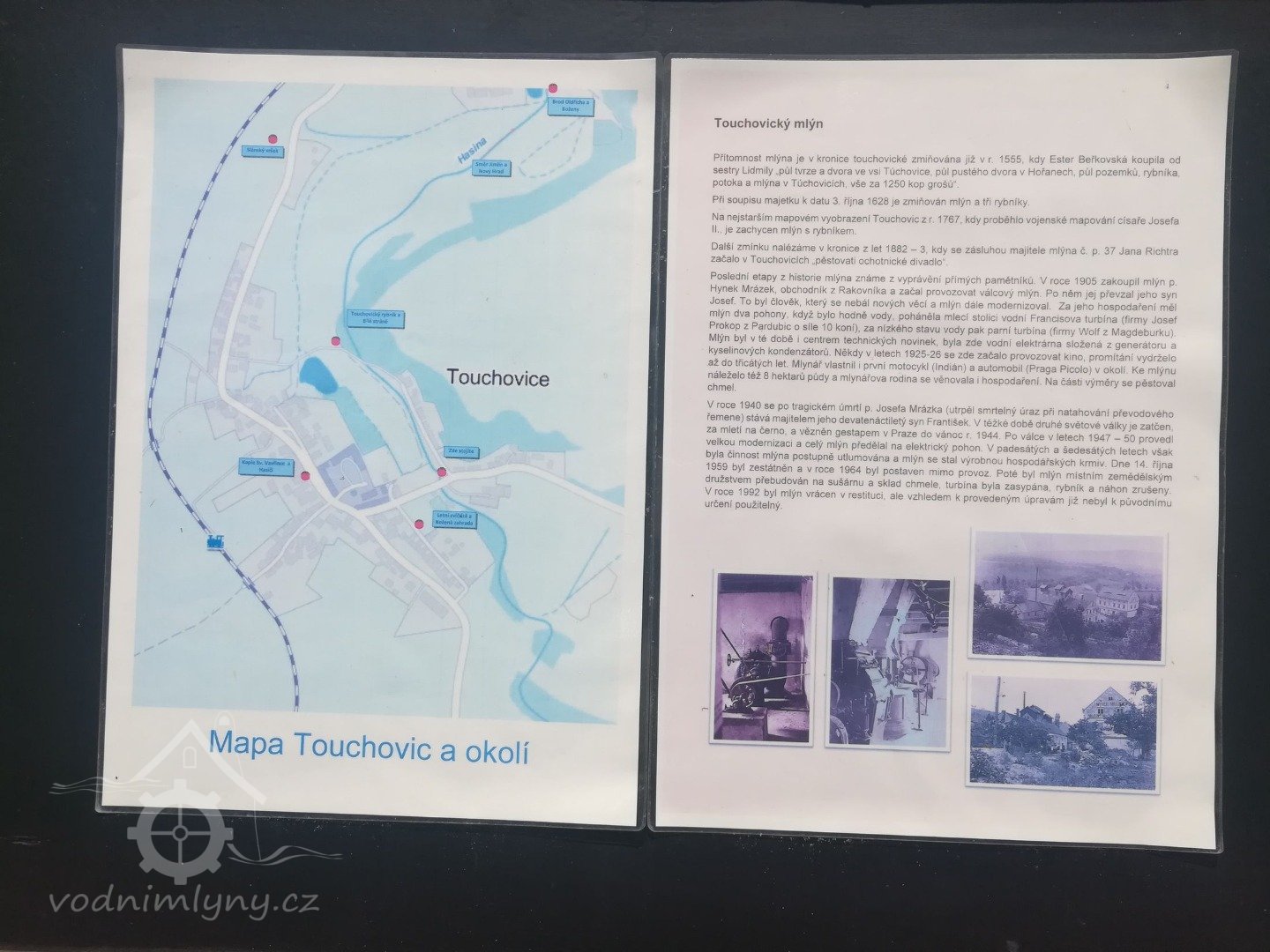 Na nejstarším mapovém vyobrazení Touchovic z r. 1767, kdy proběhlo vojenské mapování císaře Josefa II., je zachycen mlýn s rybníkem.