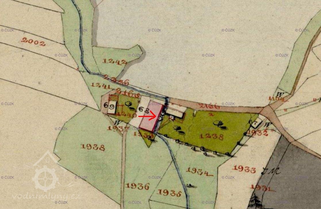 -mlýn k čp.26/st.p.70.Tento objekt byl v r.1900 prodán a v Pozemkové knize zapsán ve vložce č.180.