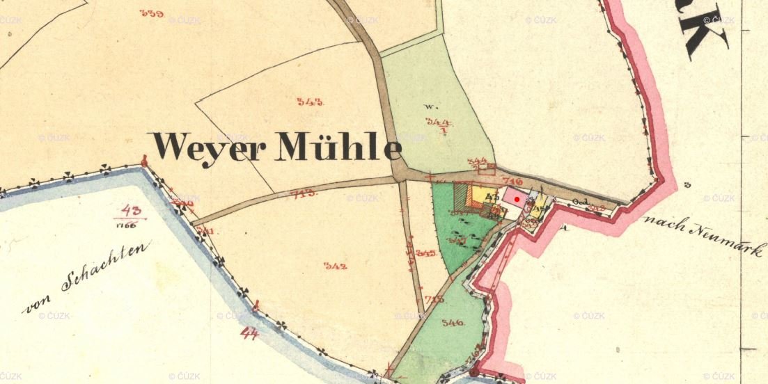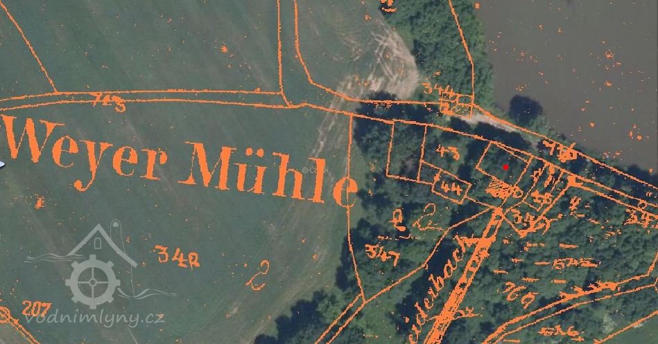 Myslívský mlýn, Mlýn na rybníce; Weihermühle, Weyer mühle,
