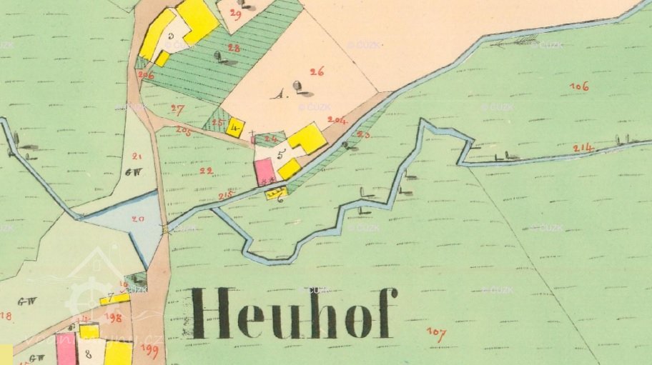 Mlýn je zakreslen na II. i III. Vojenském mapování. Na indikační skice stabilního katastru 2 kola v nespalné budově, na druhé straně pila ve spalné budově, okolo mlýna další 2 spalné budovy a zděná kaplička. Stejné na otisku stabilního katastru z roku 1837.