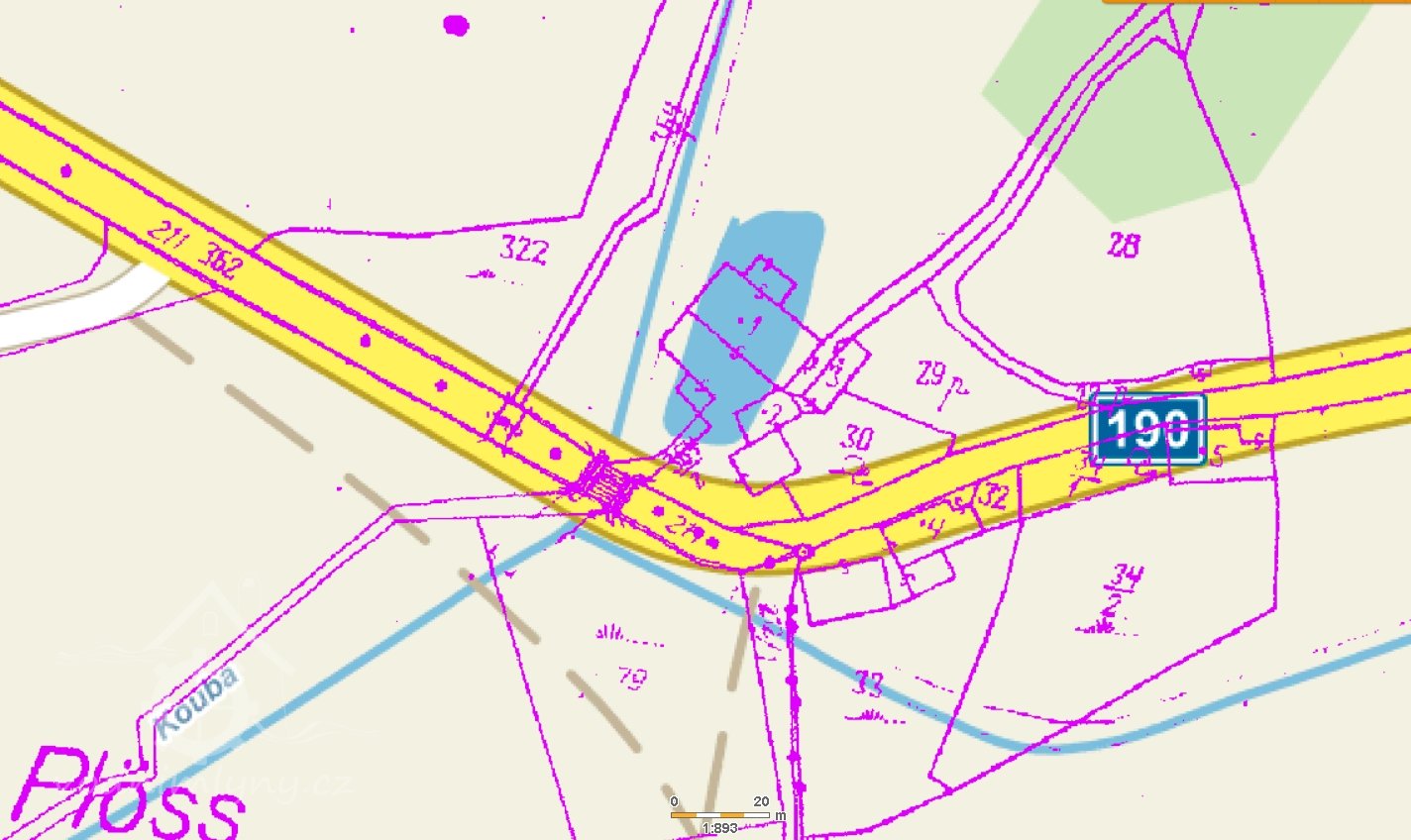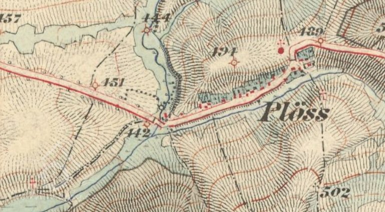 Seznam a mapa vodních děl republiky Československé 1930 : Chamský potok ( Kouba ) Pláně,  František Stauber, mlýn a pila, 1 kolo na svrchní vodu, 0,104-3,6-3,2.