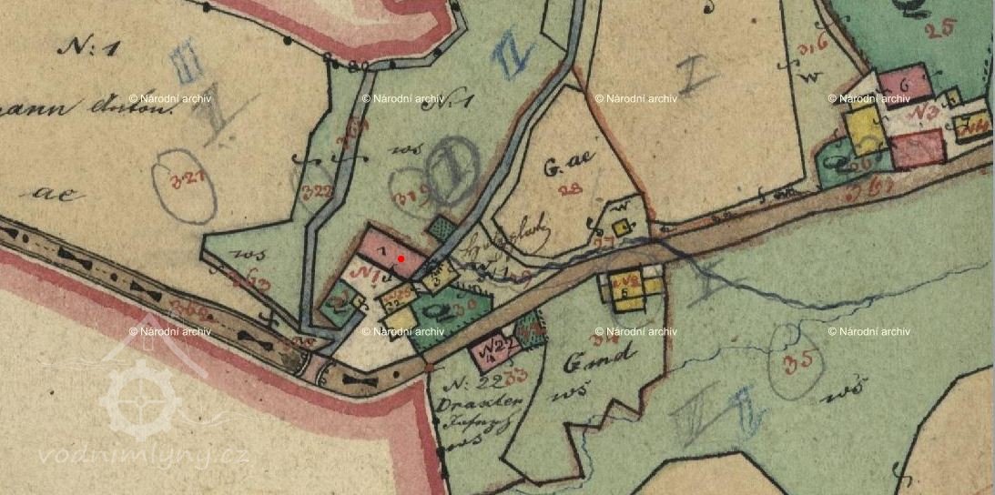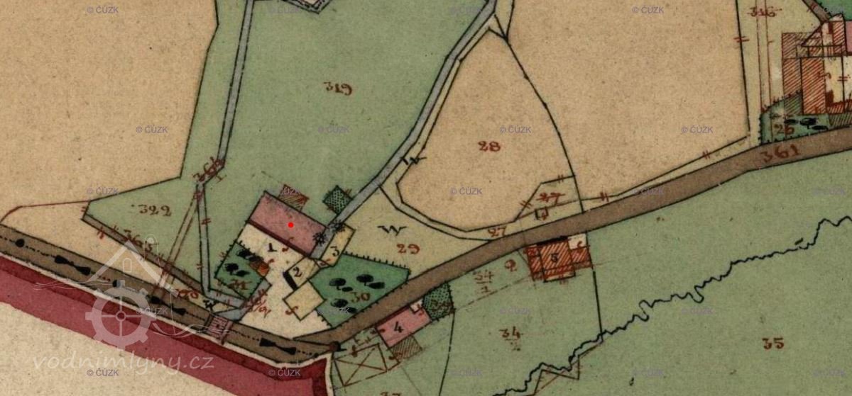 PopisV Seznamu a mapě vodních děl republiky Československé z roku 1930 je uveden mlýn s 1 kolem na svrchní vodu a pila, množství vody v m3/vt. 0,104, spád 3,6 m, normální výkon vodního díla 3,2 k.s. Podnikatel vodního díla: František Stauber.