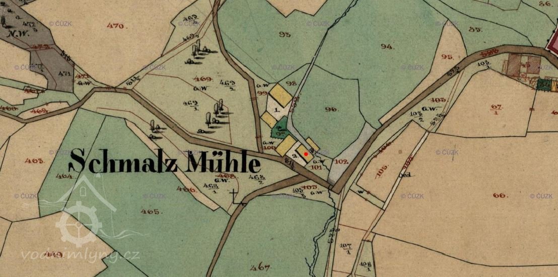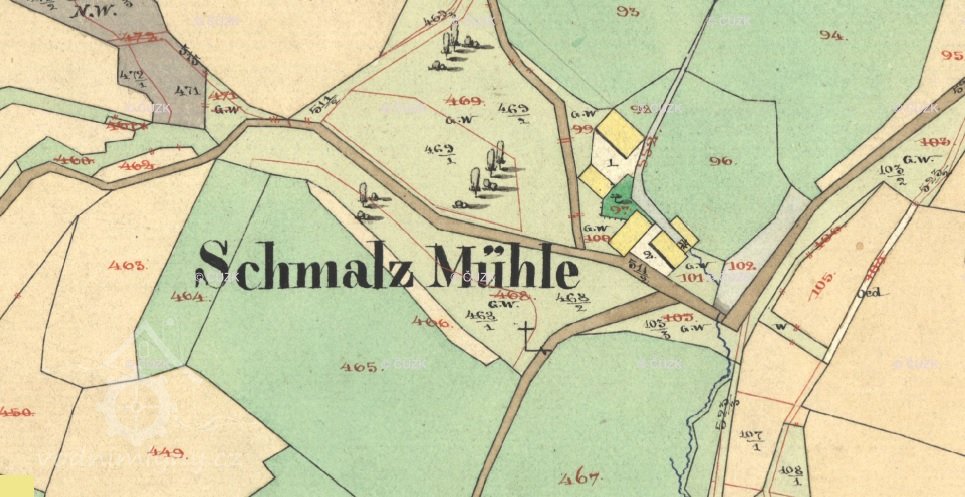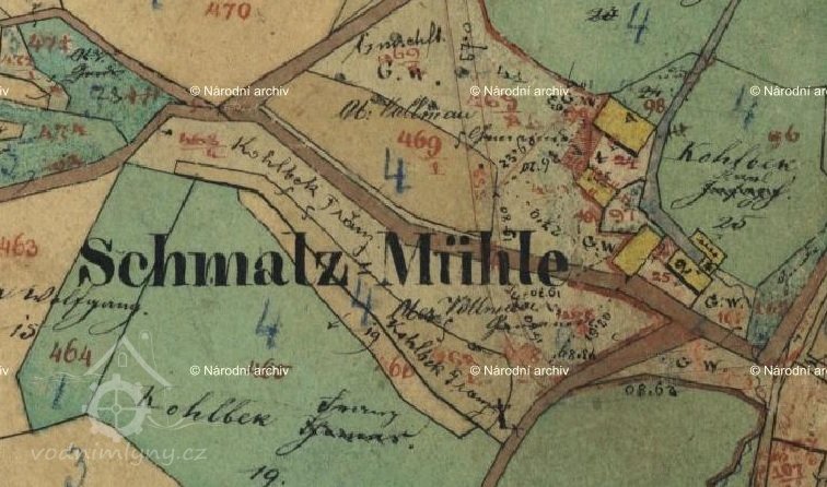 Dle sčítání obyvatel z let 1869, 1880 i 1890 mlynářem Karl Kolbeck *1840 s rodinou. Na indikační skice stabilního katastru, zde z roku 1870, uveden mlynář Karl Kohlbek,  Schmalz Mühle, dvě nespalné budovy, 1 kolo, mlýn a pila. Ve sčítání roku 1900 i 1910 mlynářem syn Karl Kolbeck *1868 s rodinou.