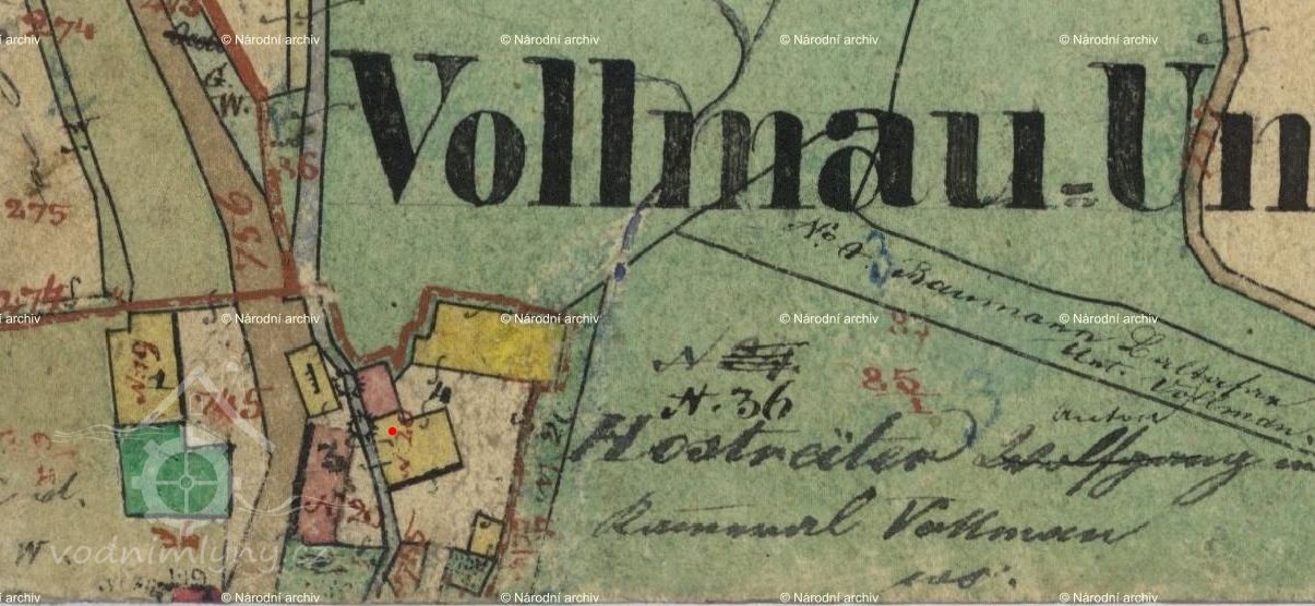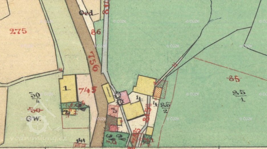PopisV Seznamu a mapě vodních děl republiky Československé z roku 1930 je uveden mlýn s 1 kolem na svrchní vodu, množství vody v m3/vt. 0,086, spád 6,6 m, normální výkon vodního díla 4,3 k.s. Podnikatel vodního díla: Jan Bauman.