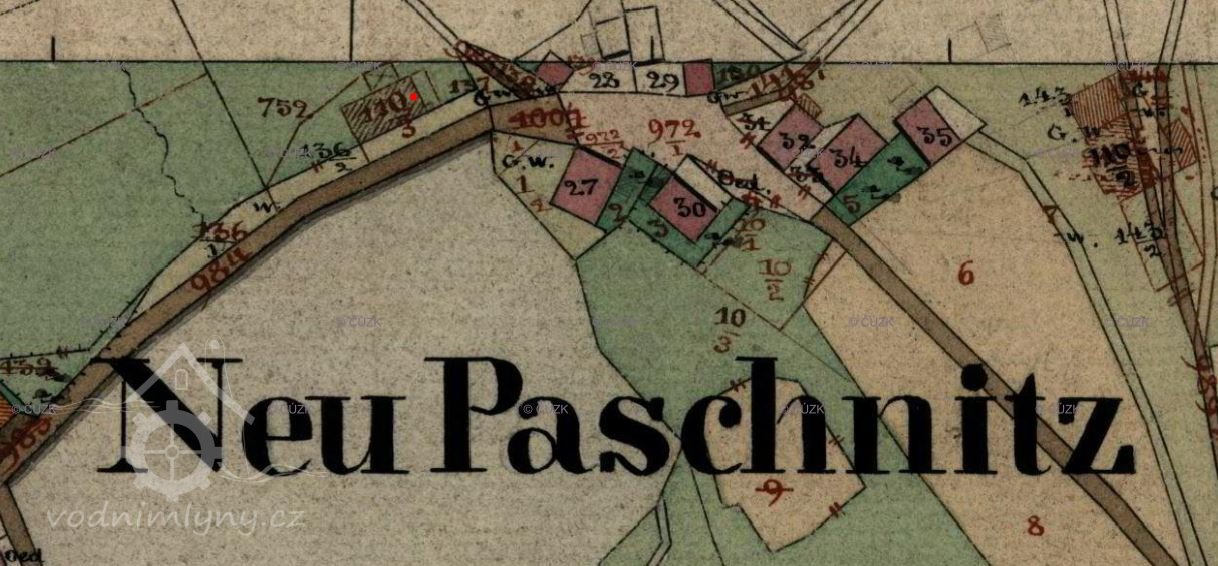 Seznam vodních děl republiky Československé 1930 – Obecní rybník, Pasečnice 30 , Tomáš Suchý, mlýn s 1 kolem na svrchní vodu