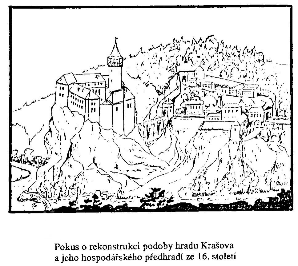 Nedestruktivní výzkum hradu Krašova, který byl založen před rokem 1232, prokázal rozsáhlé a velmi dobře dochované předhradí s mnohačetným hospodářským vybavením (Durdík 1996: 150). V blízkosti hradního komplexu byly objeveny pozůstatky vodního mlýna, zaniklého nejspíše na počátku 17. století, rozprostírajícího se na ploše přibližně 20 m2 (obr. 4). Objekt sestává ze sbíraného kamene na maltu. Je členěný na mlýnici a lednici. Vnější rozměry mlýnice jsou 4 x 4 m. Prostora pro kolo na horní vodu – tedy lednice se rozkládá na ploše 4 x 1 m. Dle písemných pramenů stávala v blízkém sousedství tohoto objektu ještě jedna drobná stavba na vodní pohon, patrně mlýn, zachycený v roce 1674 na prvém známém vyobrazení hradního komplexu. Tato mapa plasského panství napomohla jeho lokalizaci do prostoru vyrovnané plošiny, do kaskády, nad v terénu patrný starší vodní mlýn. Současně byl v reliéfu zdejšího lesního porostu zjištěn mlýnský žlab, který přiváděl vodu do nedalekých rybníků, z nichž odtékala voda na oba mlýnské provozy (Durdík 1983: 473: 475).