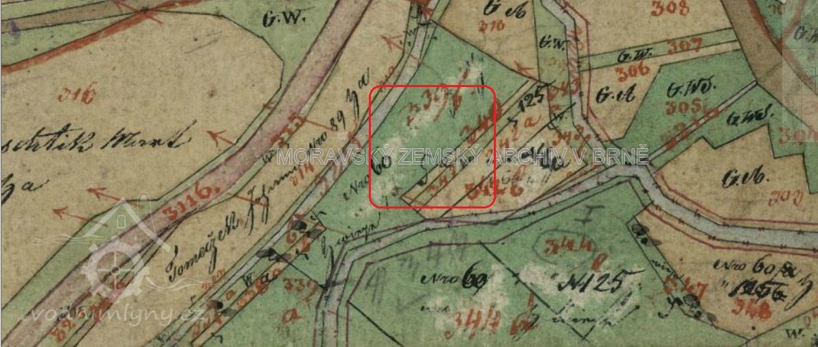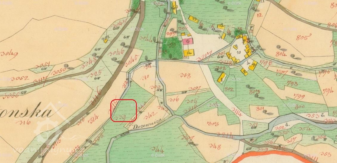 Popis'V roce 1930 pohání pilu kolo na svrchní vodu s průtokem 0.059 m3/s, spádem 5.9 m o výkonu 3 k.