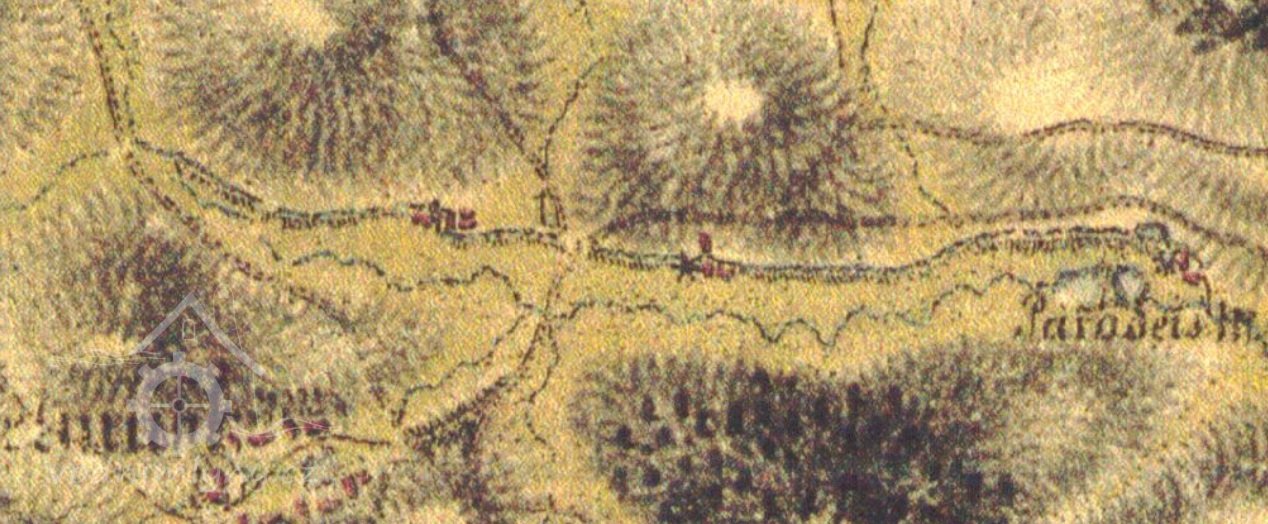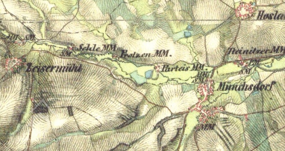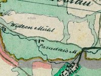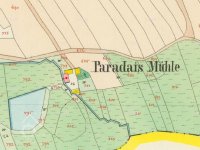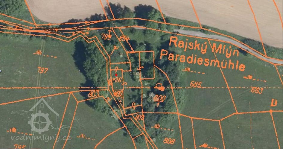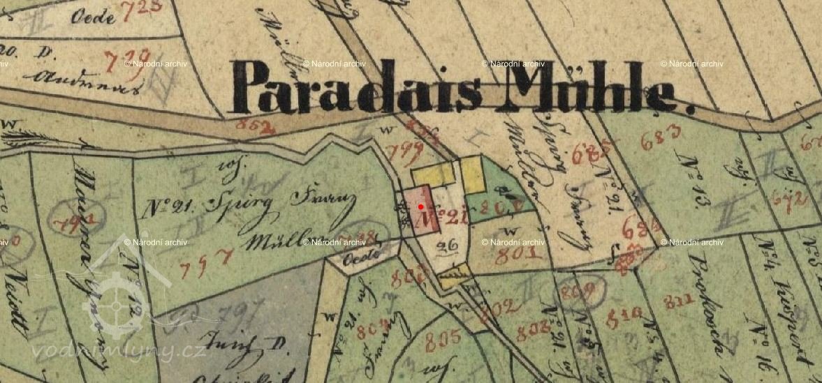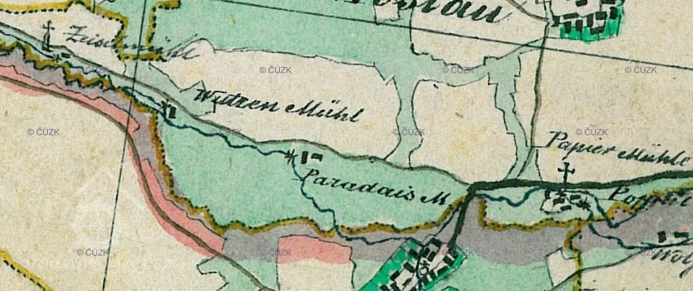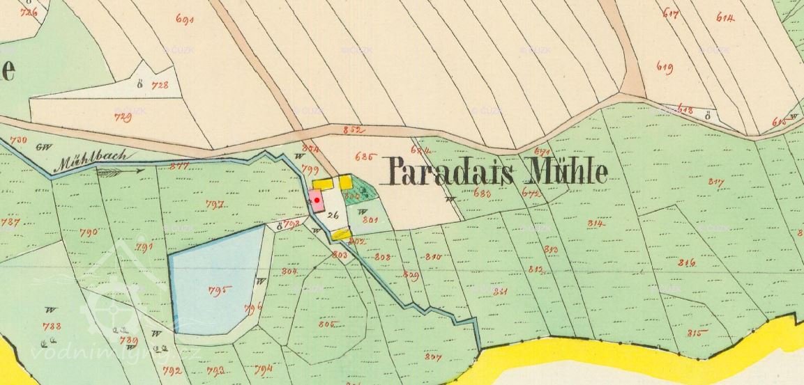 Zobrazen na mapě I. vojenského mapování jako Paradeis M., vznikl před rokem 1783. Na II. vojenském mapování - Františkovo (1836-1852) jako Parteis MM. Na otisku stabilního katastru z roku 1838 zakresleno 1 kolo v nespalné budově a 3 další spalné budovy v blízkosti, následně přestavěné na nespalné, stále 1 kolo. Na indikační skice 2 kola v nespalné budově, u mlýna další 2 větší nespalné budovy a 1 menší, zřejmě hospodářské stavení, vchod do mlýna na východní straně objektu, mlynář Franz Spring.