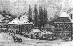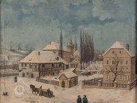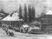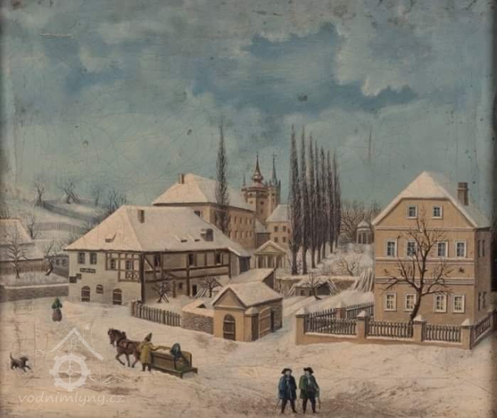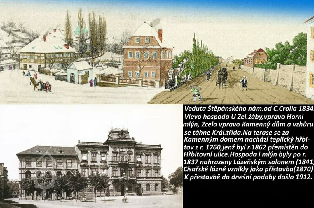 "Velmi starou žánrovou zimní vedutu na Mlýnském náměstí vytvořil malíř C. Croll roku 1834. Vpravo spatříme horní mlýn, vlevo hospodu U Zelené žáby, kde bývalo velmi živo. Roku 1870 došlo ke zboření horního mlýna a na jeho místě vznikla první klasicistní verze Císařských lázní" facebook stránka Teplické lahůdky, pan Sebastian Novotný