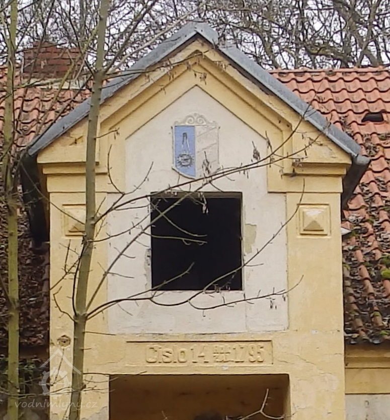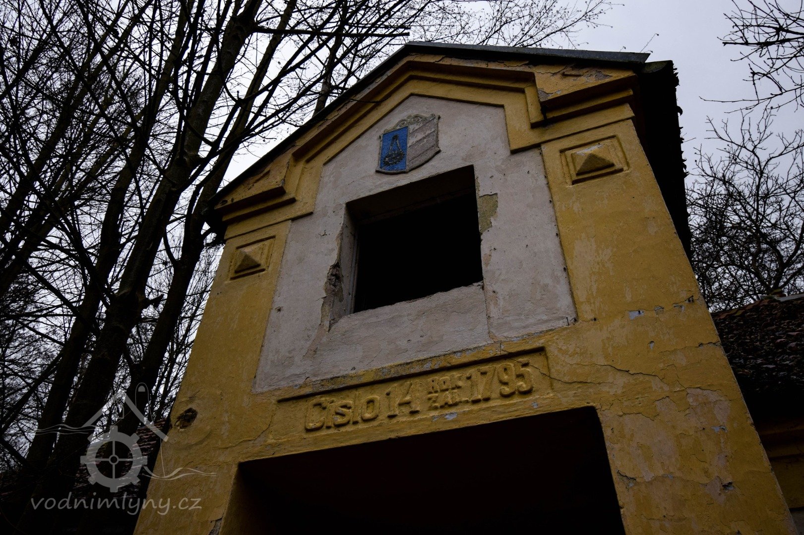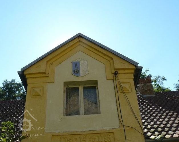 Vikýř obytné budovy s mlynářským znakem, čp. 14 a rok zal. 1795, 2019, © doxa, (Prvky na obrázku: epigrafické památky (nápisy, datování aj.), zdobený zděný štít)