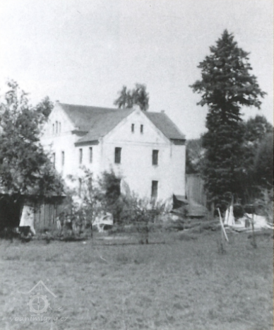 Budova mlýna z r. 1911 - štít, nedatováno, © autor neznámý, (Prvky na obrázku: okno, epigrafické památky (nápisy, datování aj.), plastická omítková výzdoba fasád a štítů, zdobený zděný štít)
