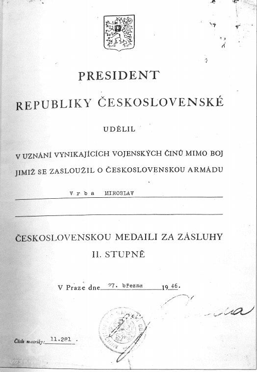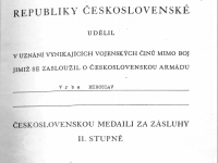 27.3.1946 mu prezident republiky udělil Čs. medail za zásluhy II. stupně