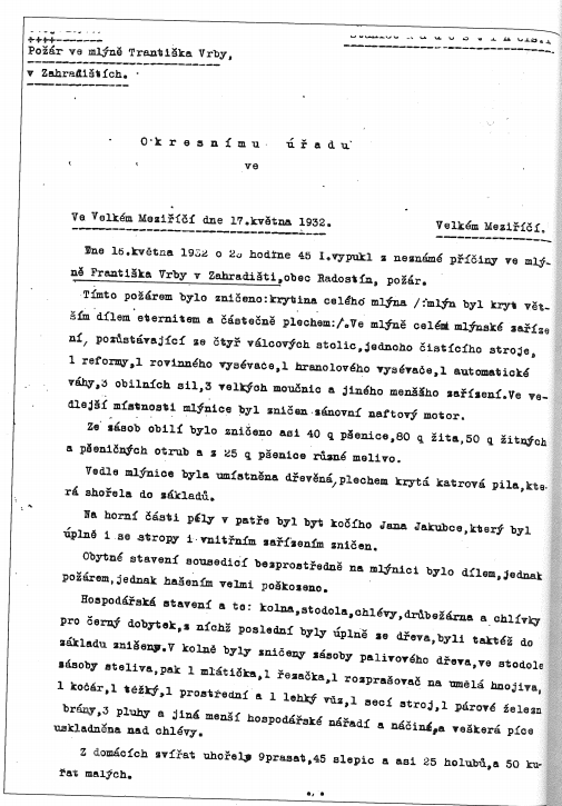 Shořelo celé zařízení mlýna, 80 q žita, 40 q pšenice, 50 q žitných a pšeničných otrub, 25 q rozemletého obilí