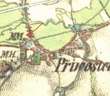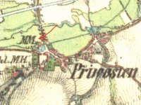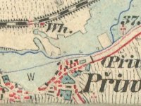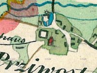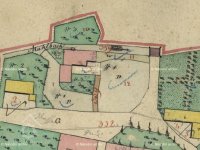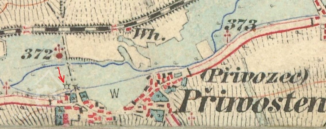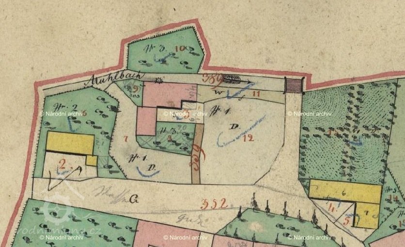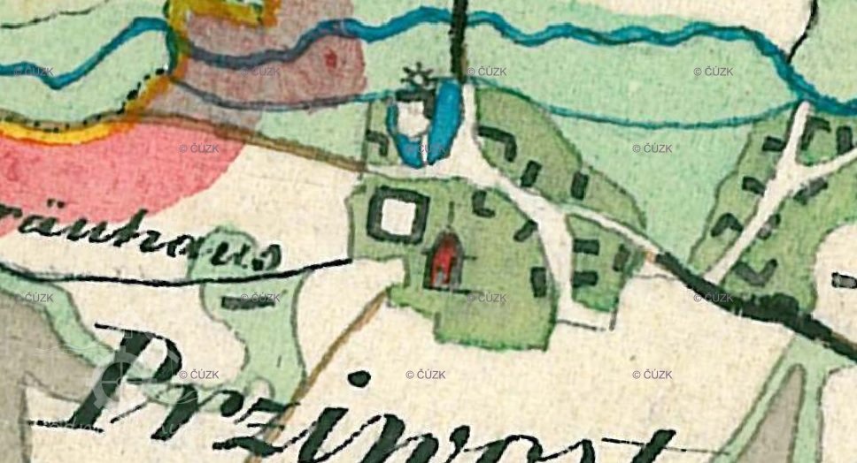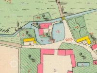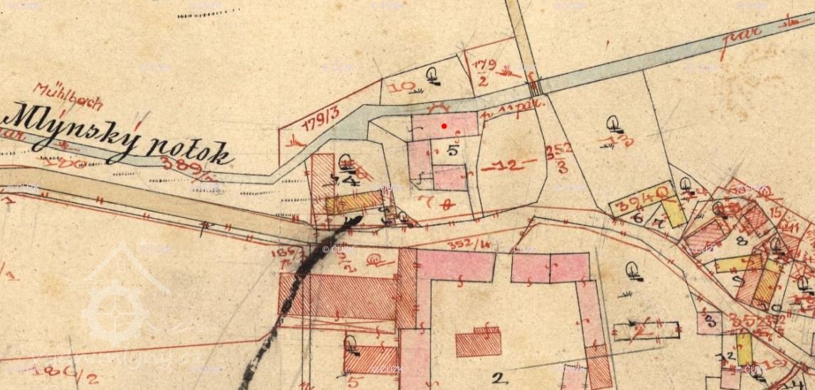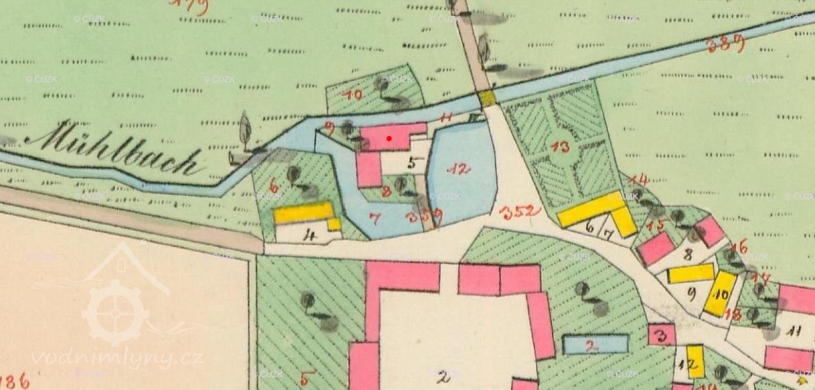 Zobrazen již na I. vojenském mapování – josefském 1764-1768 a 1780-1783. Skica a otisk stabilního katastru 1838 – dvě nespalné budovy situované do písmene L, jedno kolo, náhon z Radbuzy, retenční nádrž, majitelem Jakub Holub.