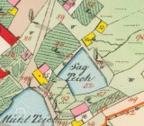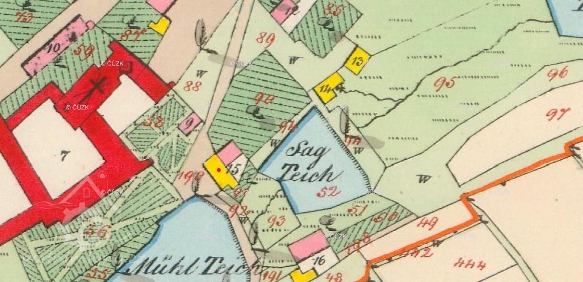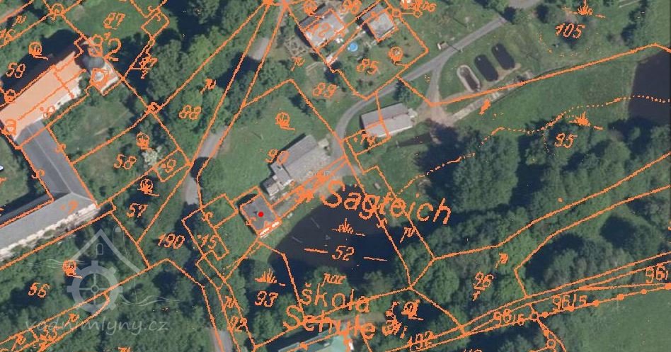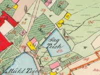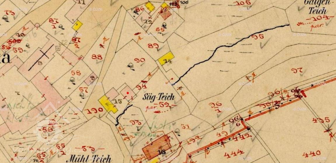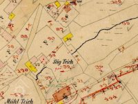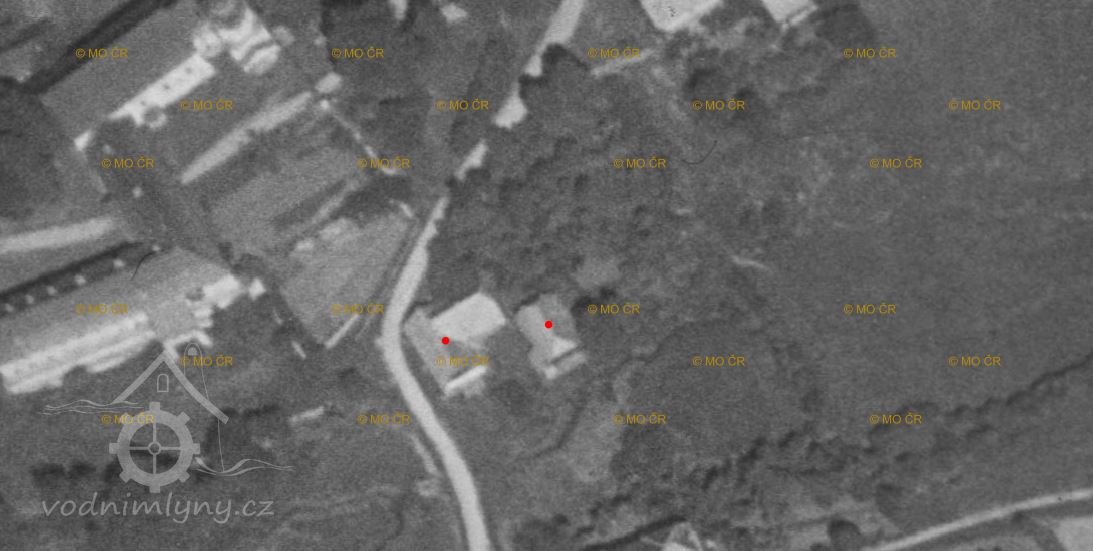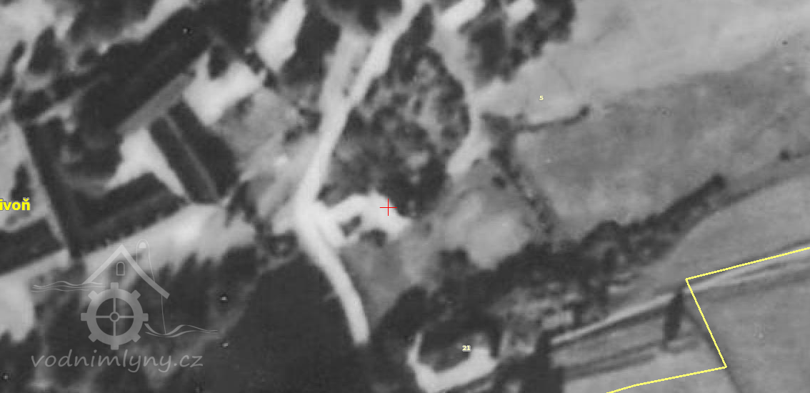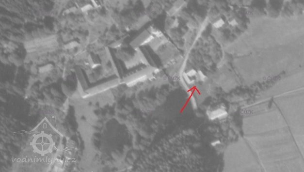 Na skice a otisku stabilního katastru v roce 1838 zakreslen mlýnský rybník, nespalná budova s jedním kolem, k hlavní budově menší dřevěná přístavba. Pod mlýnem je zakreslen další rybník a pila.
