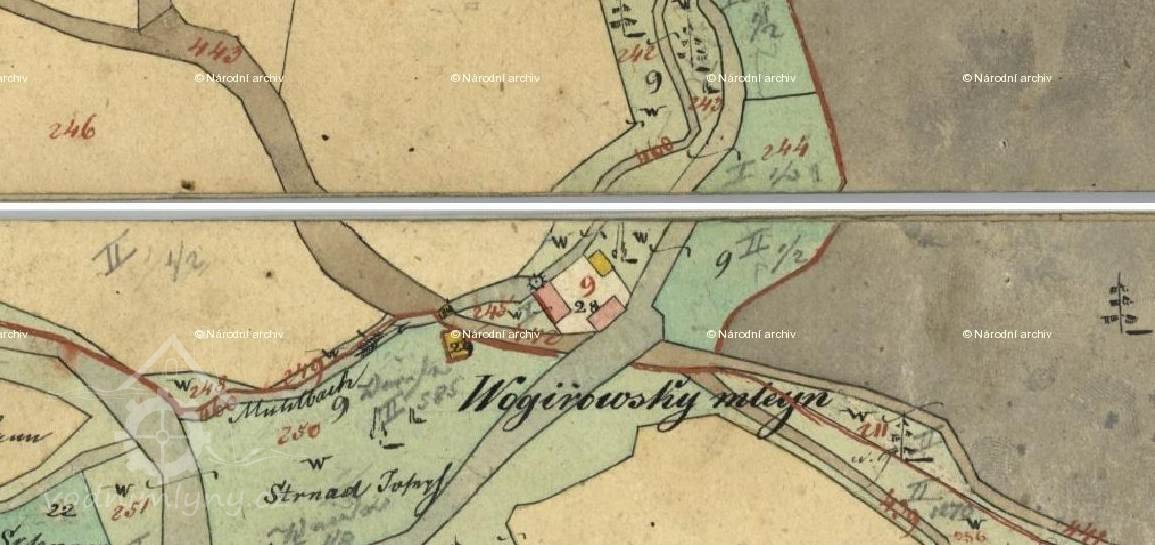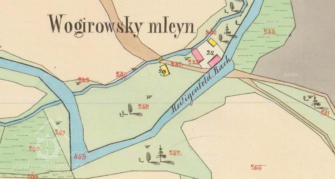 Na mlýn tento táhne se vody dvěma stavidly, jejichž práh / vršek tohoto/ o 0,60 mtr. Nížeji leží nežli vršek jezu a neb 0,505 mtr nížeji leží nežli vršek normálního hřebíku.