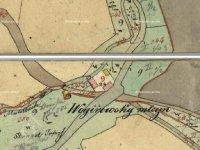 V místě od prodlouženého zájezku po potoce 4,4mt vzdáleného vztýčená na prodloužený směr tento kolmice 4,5mtr dlouhá, v jejíž koncovém bodu vykopaná 1,2mtr hluboká jáma, na jejíž spodek vložena kamenná plotna a na tuto postaven dřevěný 0,20 do čtverce silný a 0,80mtr dlouhý kůl, kterýž spodem dvěma kříž tvořícími rameny opatřen jest.